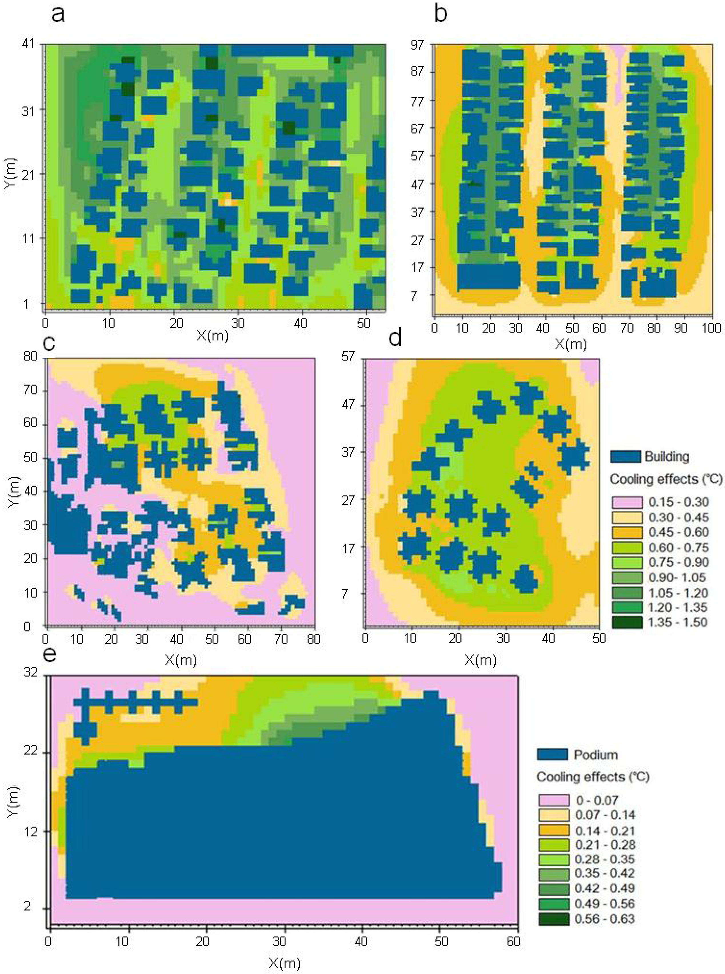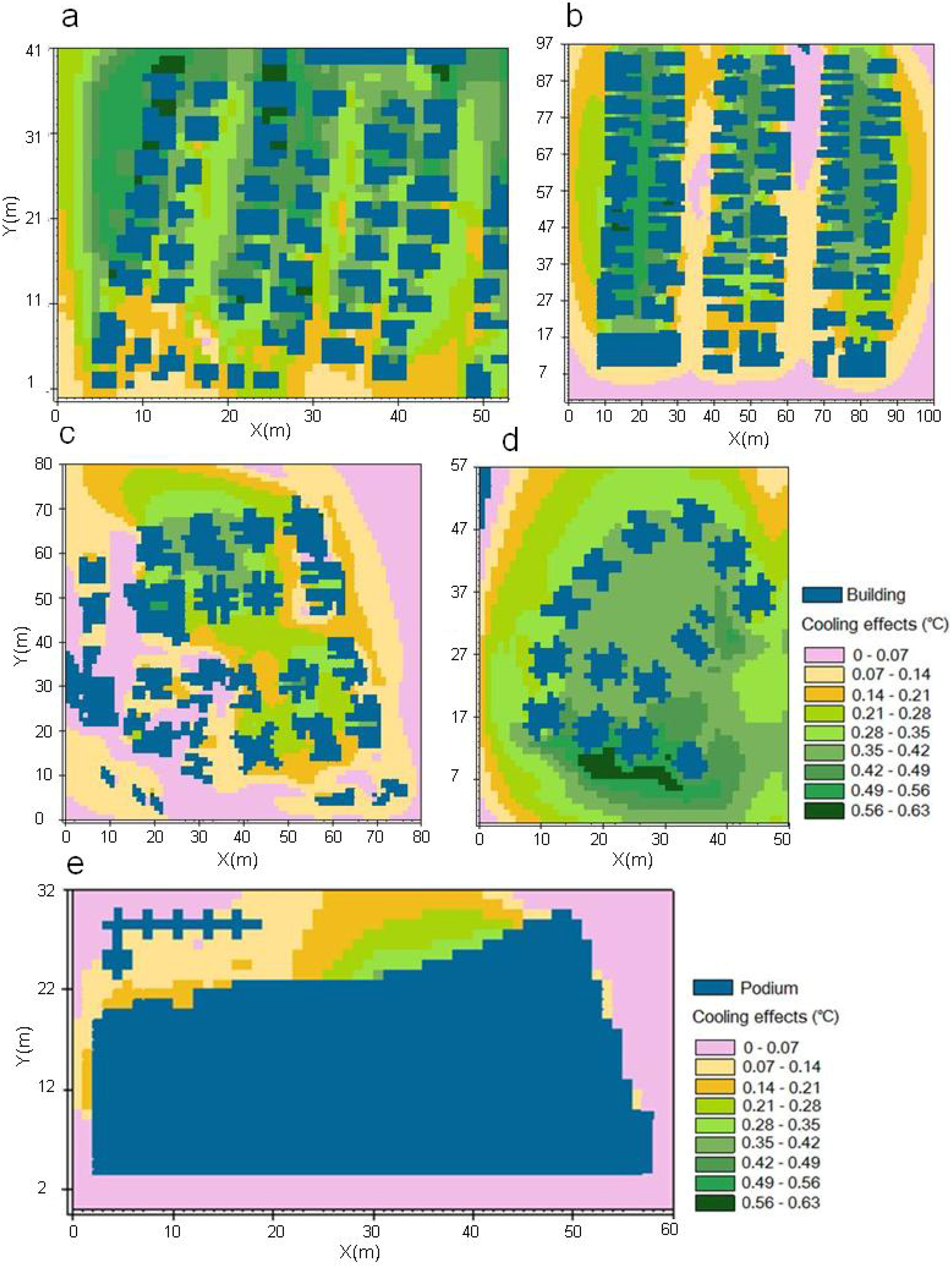 Horizontal distribution of cooling effects for intensive green roof (IGR) at the rooftop-podium level at 14:00 (cooling effects refer to the air-temperature differences between the bare and green-roof scenarios). (a) KT; (b) KC; (c) BC; (d) CM; (e) MF.