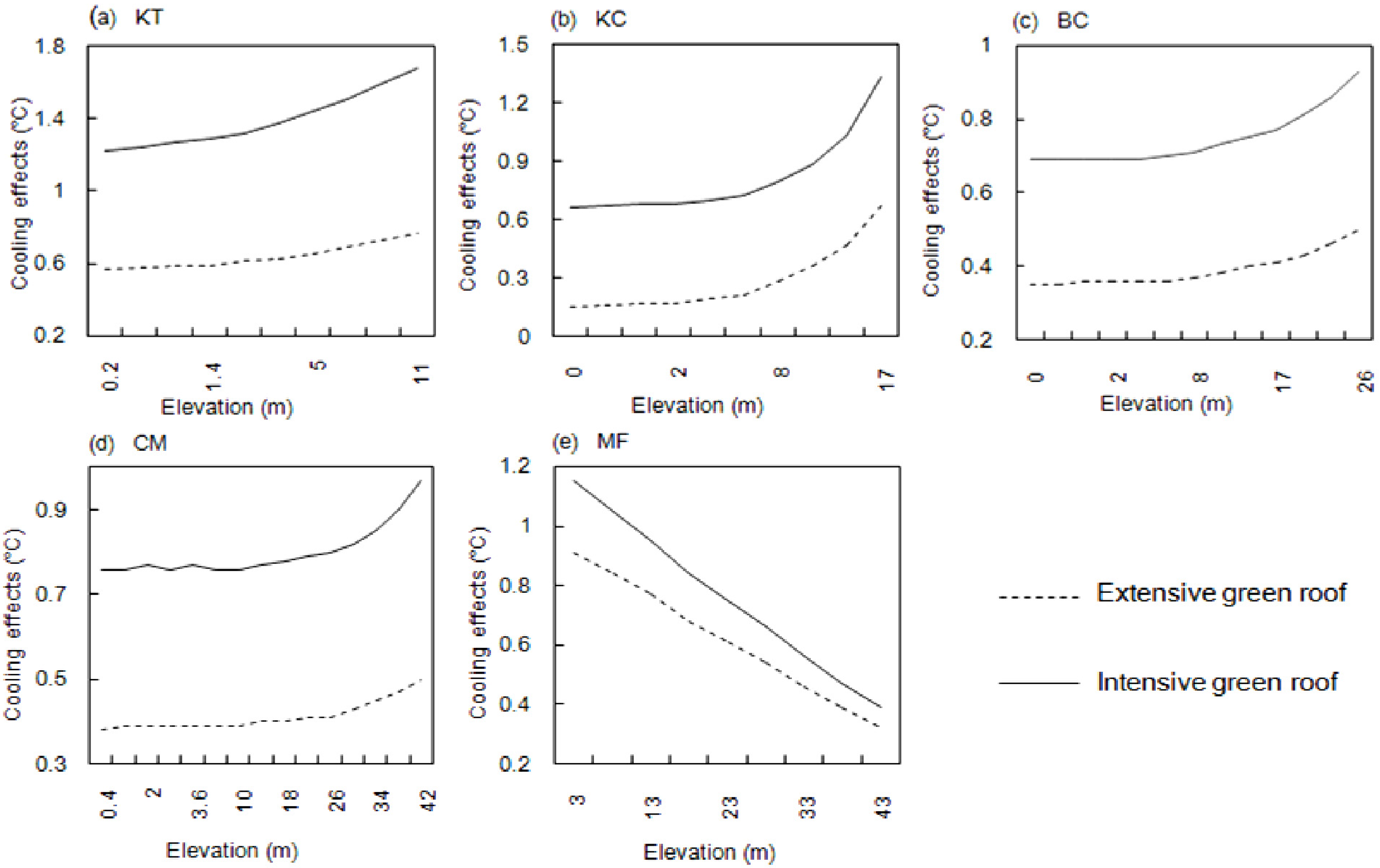 Figure 8). The results indicate that the maximum cooling intensity in a study site is negatively related to building height. The downward spill or vertical advection of cool air generated by green roofs could be dispersed, diluted and dissipated in its descent if the roof-to-street height difference is too high. In low-rise sites KT and KC, the IGR lower the pedestrian-level air temperature by up to 1.7 °C, and 1.5 °C, respectively; they are twice of the maximum values in the mid-rise BC and high-rise CM sites (