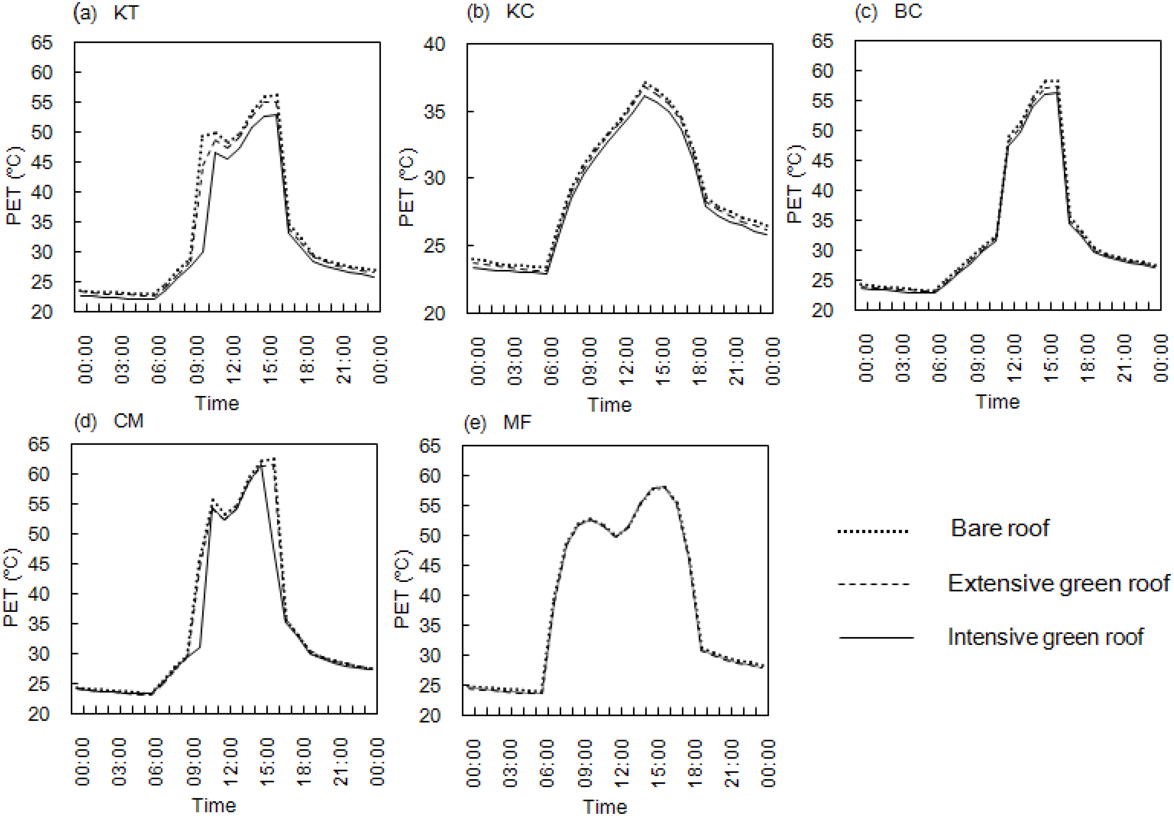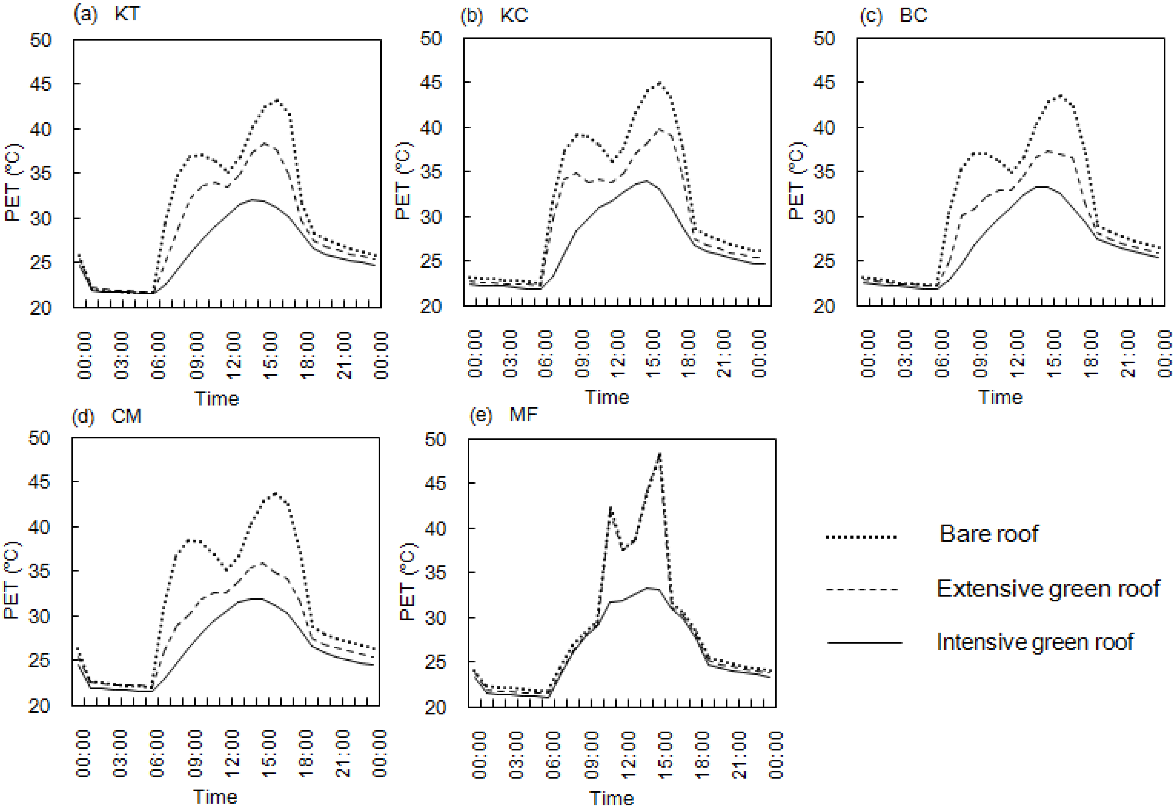 We investigated the diurnal PET at both rooftop-podium and pedestrian levels under three roof scenarios (bare roof, and EGR and IGR) at each study site. The receptors for calculation of PET were placed in the middle of the main road in each of the study sites and they were free from shading by adjacent building structures or trees.