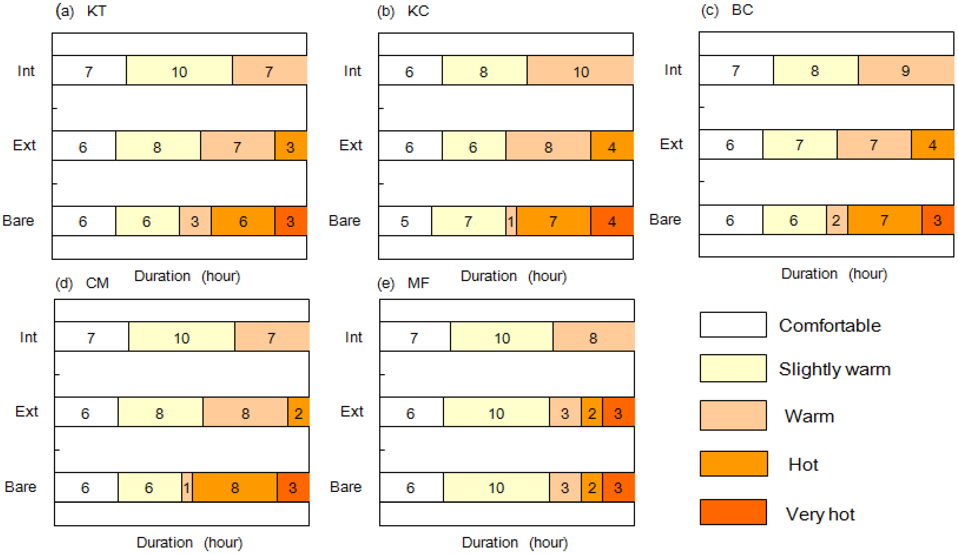 Figure 11 highlights the time durations in a day under strong heat stress (“hot” to “very hot” thermal perception) vis-à-vis the less stressful classes in relation to bare, EGR and IGR scenarios in each study site. The bare roofs experience around 3 h of “very hot” and 2–8 h of “hot” periods in daytime. EGR witness no “very hot” sensation, with “hot” period reduced to 3−4 h. For IGR, both “hot” and “very hot” sensations are absent, whilst sustaining “comfortable”, “slightly warm” and “warm” periods throughout the day.