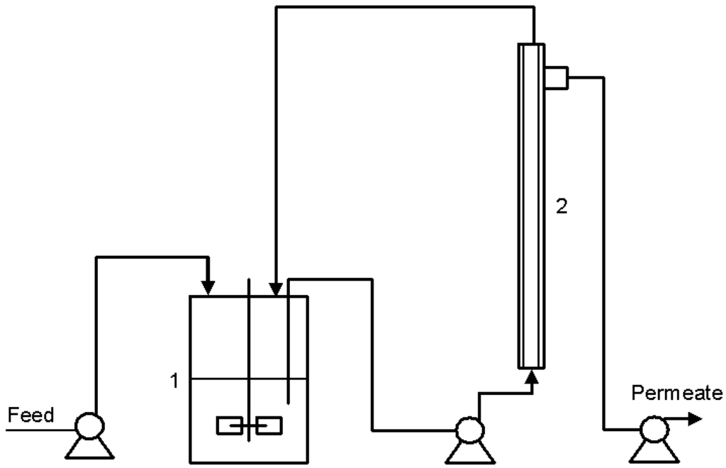 Schematic design of the bioreactor setup used during continuous cultures with yeast retention, bioreactor (1) and membrane module (2).