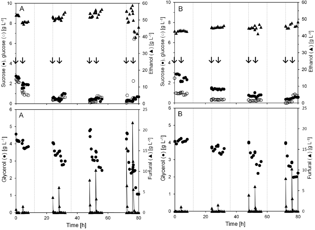 Concentrations of sucrose, glucose, ethanol, glycerol, and furfural during two anaerobic continuous cultivations with pulse injection of furfural (A and B). Each pulse injection of furfural is indicated by arrows. The gridlines denote each 12 h period in the continuous cultivation.