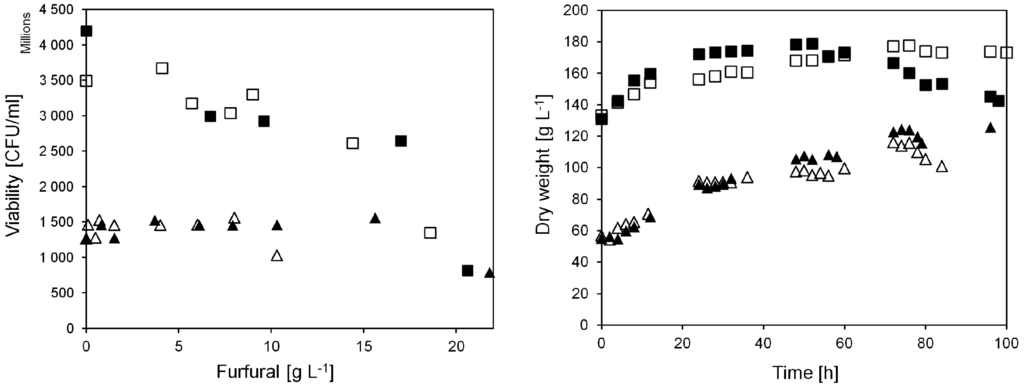 Yeast viability and biomass dry weight at different furfural additions in anaerobic continuous cultivations on sucrose. Triangular symbols denote pulse injection experiments, viability measured 4 h after furfural injection. Square symbols denote experiments with continuous furfural addition, viability measured after 24 h continuous addition of furfural at the indicated concentrations. Closed and open symbols denote cultivation A and B, respectively.