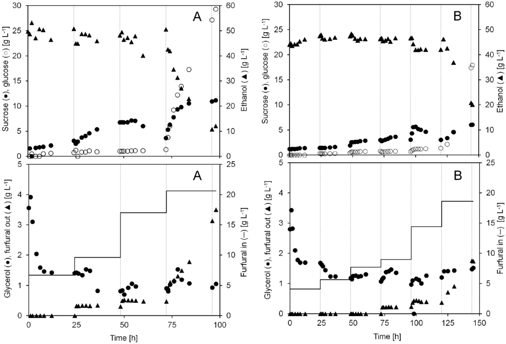 Concentrations of sucrose, glucose, ethanol, glycerol and furfural during two anaerobic continuous cultivations with continuous furfural addition (A and B). The furfural concentration (g L−1) in the inlet medium and the permeate during each cultivation day is shown in the lower graphs. After each 24 h period, denoted by the gray gridlines in the graphs, the furfural concentration in the inlet medium was increased to the indicated concentration.