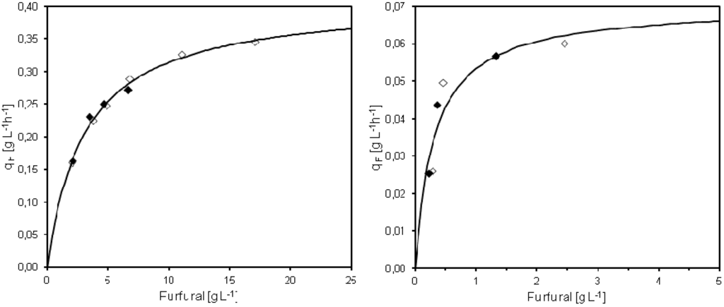 Summary of the specific conversion rate of furfural (qF) in cultivations with pulse injection (left) or continuous (right) furfural addition. The qF values for two separate cultivations are presented together with the regression curve calculated based on Michaelis-Menten kinetics. Open/closed symbols denote separate experiments.