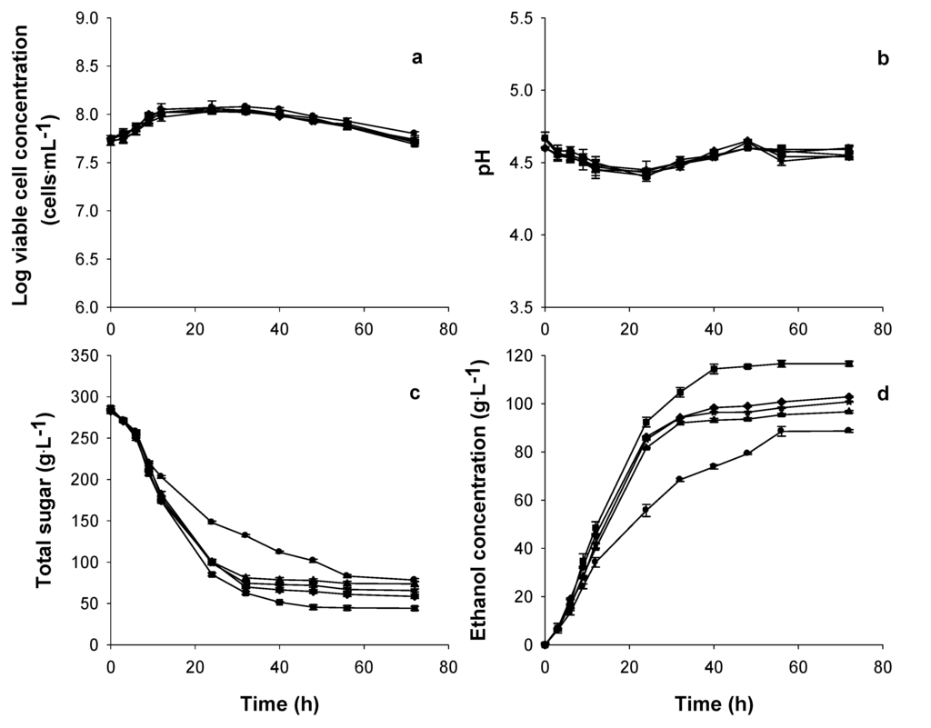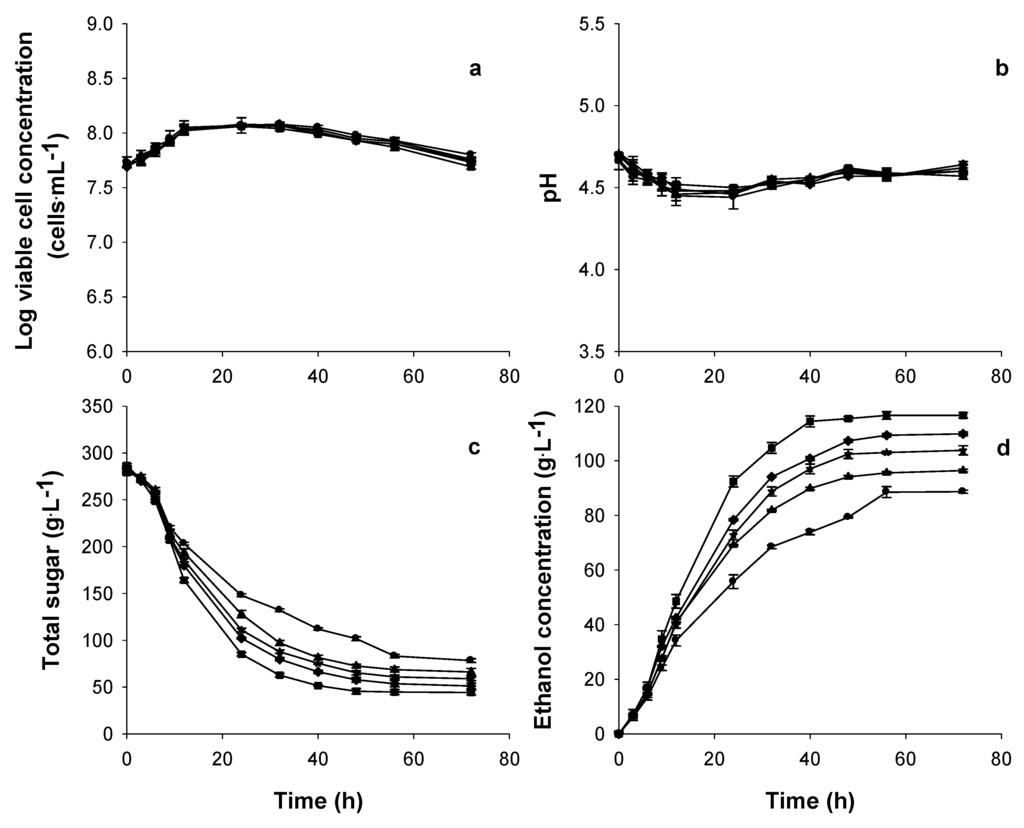 Fermentation parameters during single batch ethanol production from sweet sorghum juice with and without DSYH (dried spent yeast hydrolysate) or yeast extract supplementation: no supplement (●), 11 (▲), 16 (★), 21 (♦) g·L−1 of DSYH and 9 g·L−1 of yeast extract (■). (a) Log viable yeast cells, (b) pH, (c) total sugar and (d) ethanol concentration.