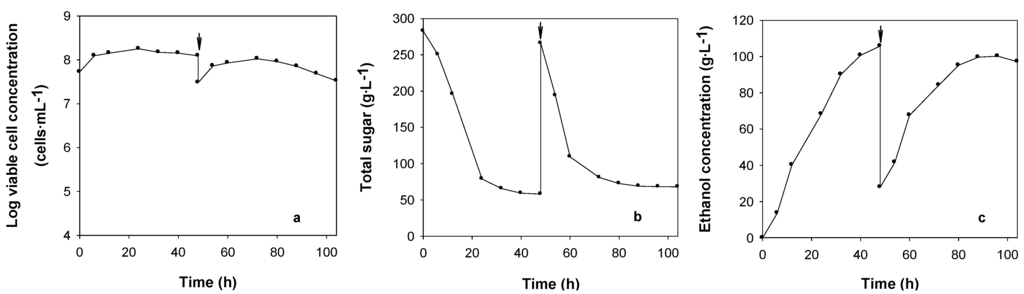 Fermentation parameters during two cycles of repeated-batch ethanol production from sweet sorghum juice containing 280 g·L−1 of total sugar and 21 g·L−1 of DSY (dried spent yeast) in the 2-L fermenter. (a) log viable yeast cells; (b) total sugar; (c) ethanol concentration. The arrows indicate the start time of each batch.