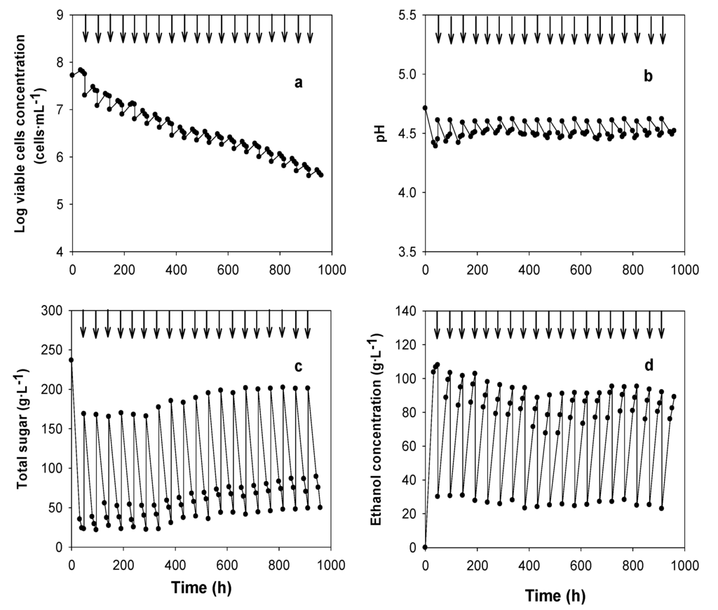 Fermentation parameters during 20 cycles of repeated-batch ethanol production from sweet sorghum juice containing 240 g·L−1 of total sugar and 21 g·L−1 of DSY (dried spent yeast) in the 2-L fermenter. (a) log viable yeast cells; (b) pH; (c) total sugar; (d) ethanol concentration. The arrows indicate the start time of each batch.