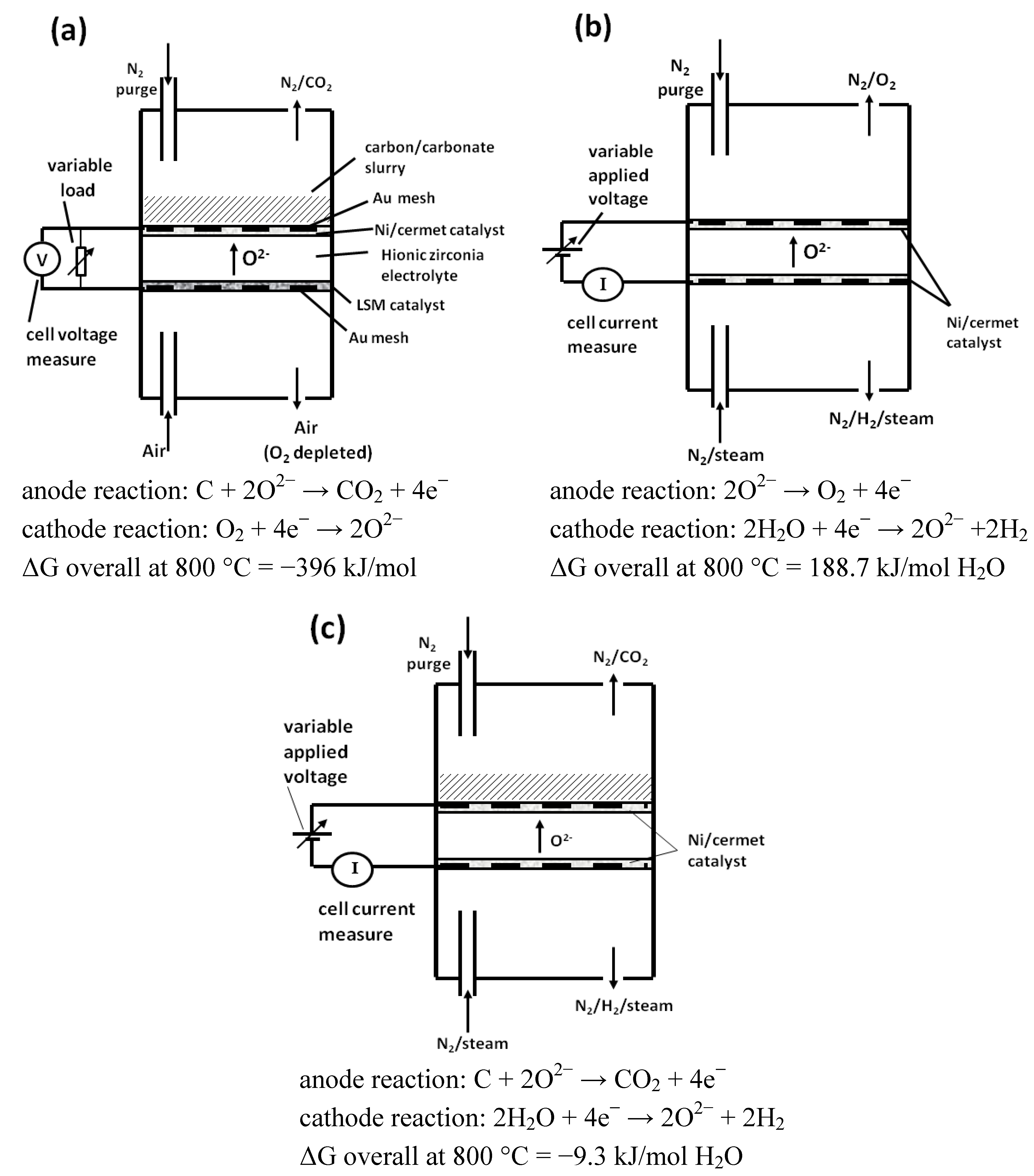 Overall schematic of the operation of the three cell geometries used. Each cell body is immersed in a furnace environment. (a) carbon fuel cell; (b) electrolysis cell (EC); (c) carbon assisted a electrolysis cell (CAEC).