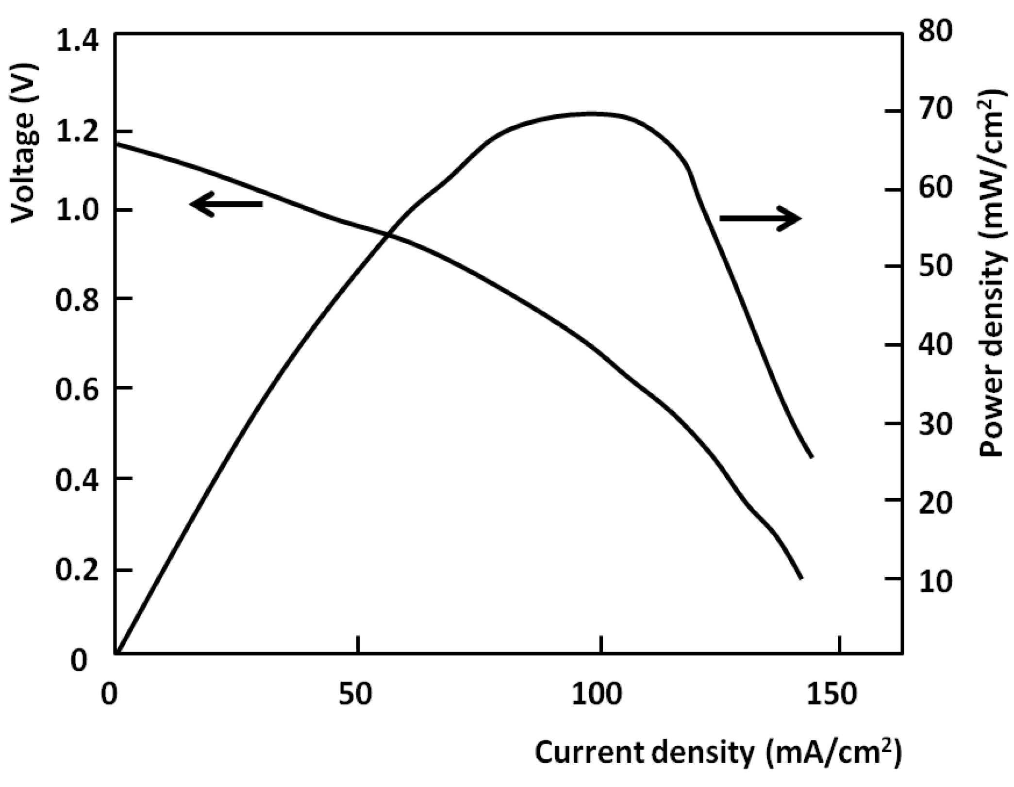 The performance of the carbon fuel cell (DCFC) at 800 °C is shown in Figure 4 in terms of cell voltage developed and power density, where the external load was varied from open circuit to 1.2 Ω. The current-voltage curve shows behaviour which is consistent with that of most direct-carbon fuel cells, i.e., a voltage close to the predicted open circuit value at zero current, falling approximately linearly with increase in current density due to ohmic losses and followed by a more rapid fall at high current densities due to mass transfer polarisation at one or both of the electrodes. The open circuit voltage for this system is found to be in the range 1.15–1.2 V, which is consistent with other recently reported values for carbons, e.g., 1.2 V with petcoke [11] and coal [12] as carbonate/fuel slurries. The current density range shown is typical for this cell geometry and the results with several fabricated cells have shown closely similar behaviour.