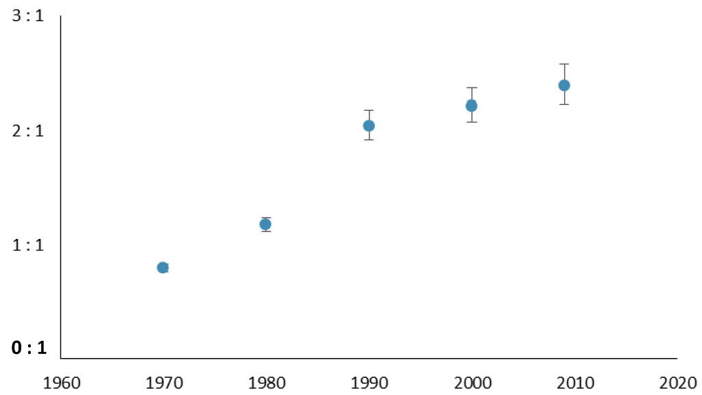 58]. To test this assumption, we calculate the EEE for the US and Canada, assuming that all output is consumed in its grain or vegetable form, and not fed to animals. Doing so suggests that the EEE for US agriculture would increase from 0.8:1 to 1.7:1 in 1970 and from 2.3:1 to 3.5:1 in 2010. For Canada the improvements in EEE are less substantial—an increase of about 40% in both 1981 and in 2009. The difference between animal-inclusive and exclusive efficiencies is a result of the large amounts of grain needed to produce an energetically smaller amount of product.