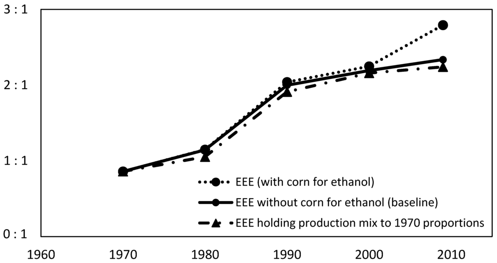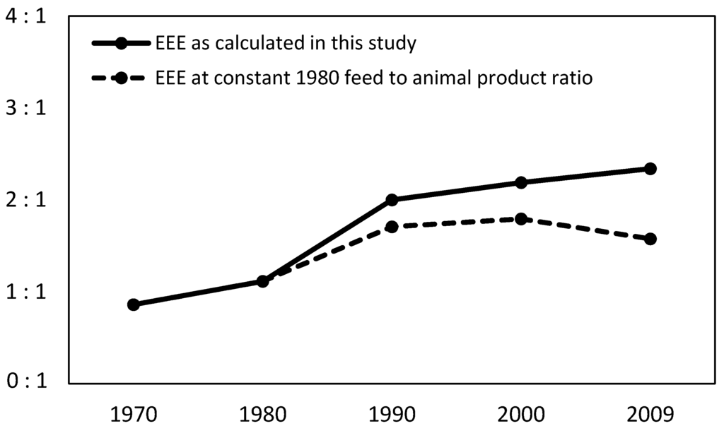 The US has reduced the amount of grain fed directly to livestock since 1980, while increasing output. This has been a force contributing to a higher EEE for the US. It appears that this is mainly because farmers have been able to substitute byproducts from the food industry and ethanol production for grain. We performed a sensitivity analysis to determine the additional grain needed to feed livestock if the feed to meat product ratio from 1980 were held constant through 2010. Doing so reduces EEE over the past three decades, especially after 2000 (