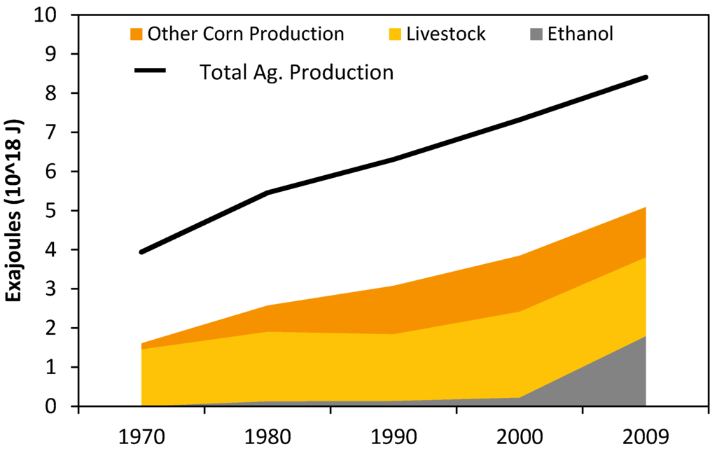 Stacked graph of corn (maize) production in the US in energy units, by end-use, from 1970 to 2009. Total US agricultural production in energy units indicated by the black line.