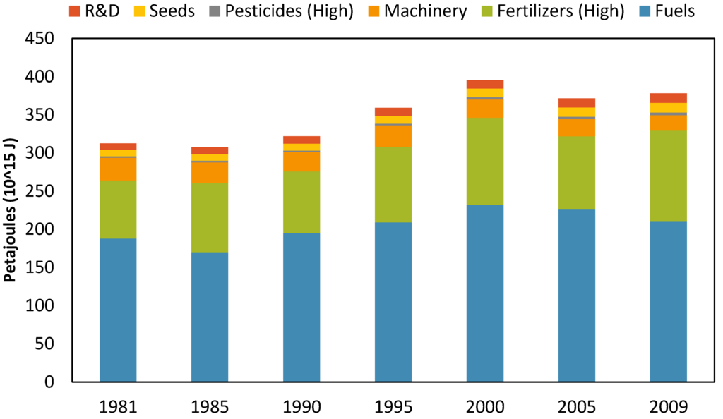 i.e., the energy associated with producing the major inputs of the agricultural system: fertilizer, seed, pesticides, fuel, and machinery [Equation (1)]: