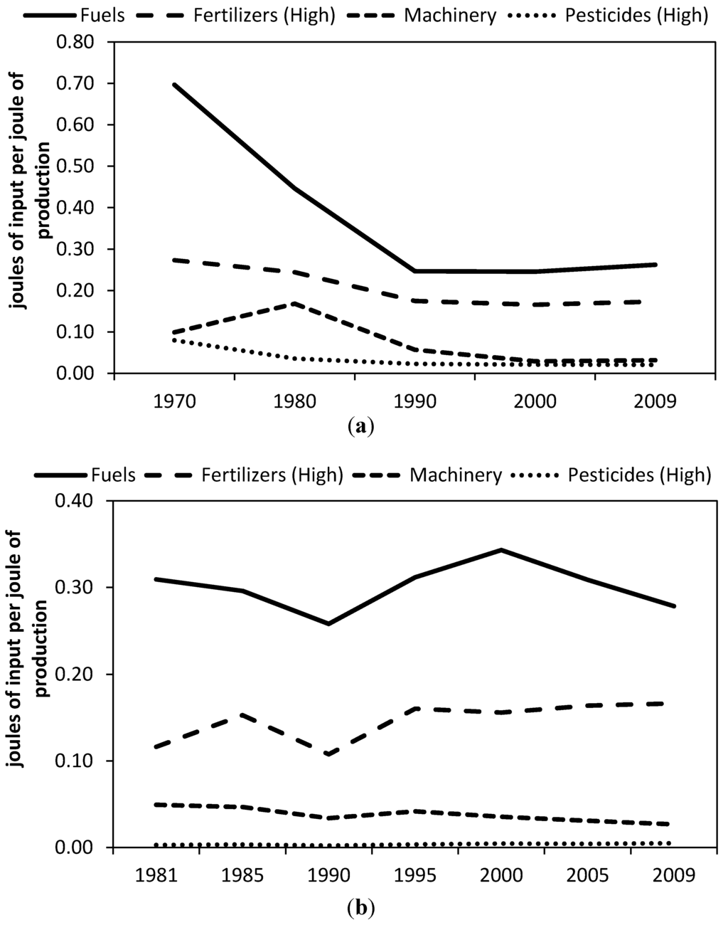 Figure 7a,b). The Canadian agricultural system required increased energy inputs for pesticides and seeds since 1981, though these make up only a small portion of total energy inputs. Fertilizer consumption per unit of output has increased in Canada, while decreasing in the US.