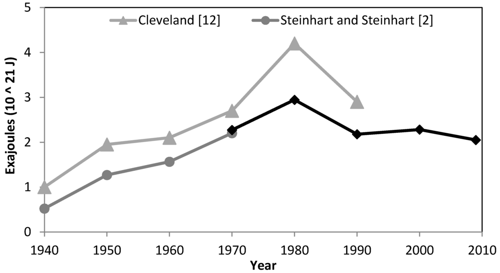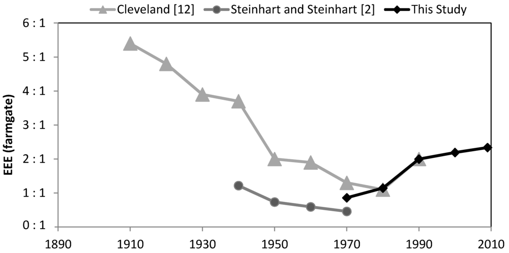 The only year in which all three datasets overlapped was 1970. Our energy input value is more consistent with Steinhart and Steinhart’s estimates; and less than Cleveland’s, however our estimates of EEE are closer to Cleveland’s estimates, which may reflect the greater importance of including food exports, or at least real production data, in the calculation of total agricultural production