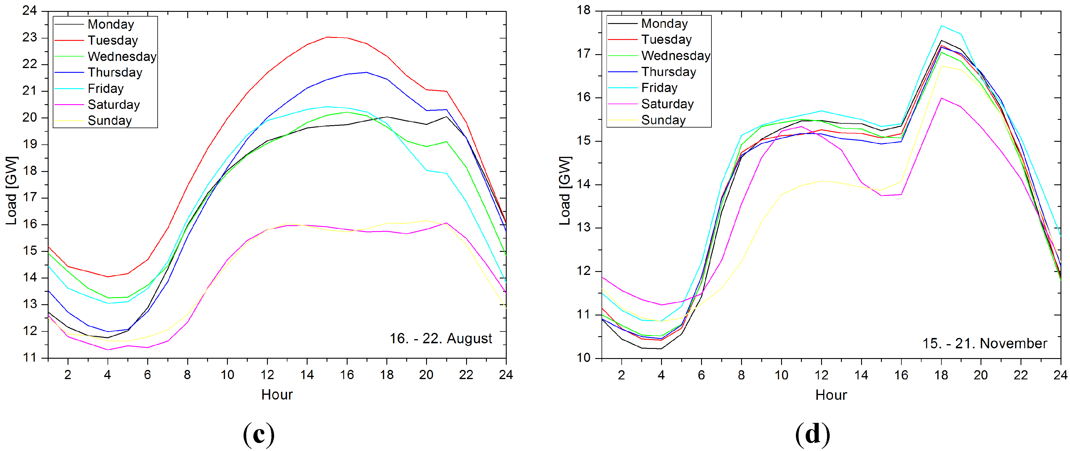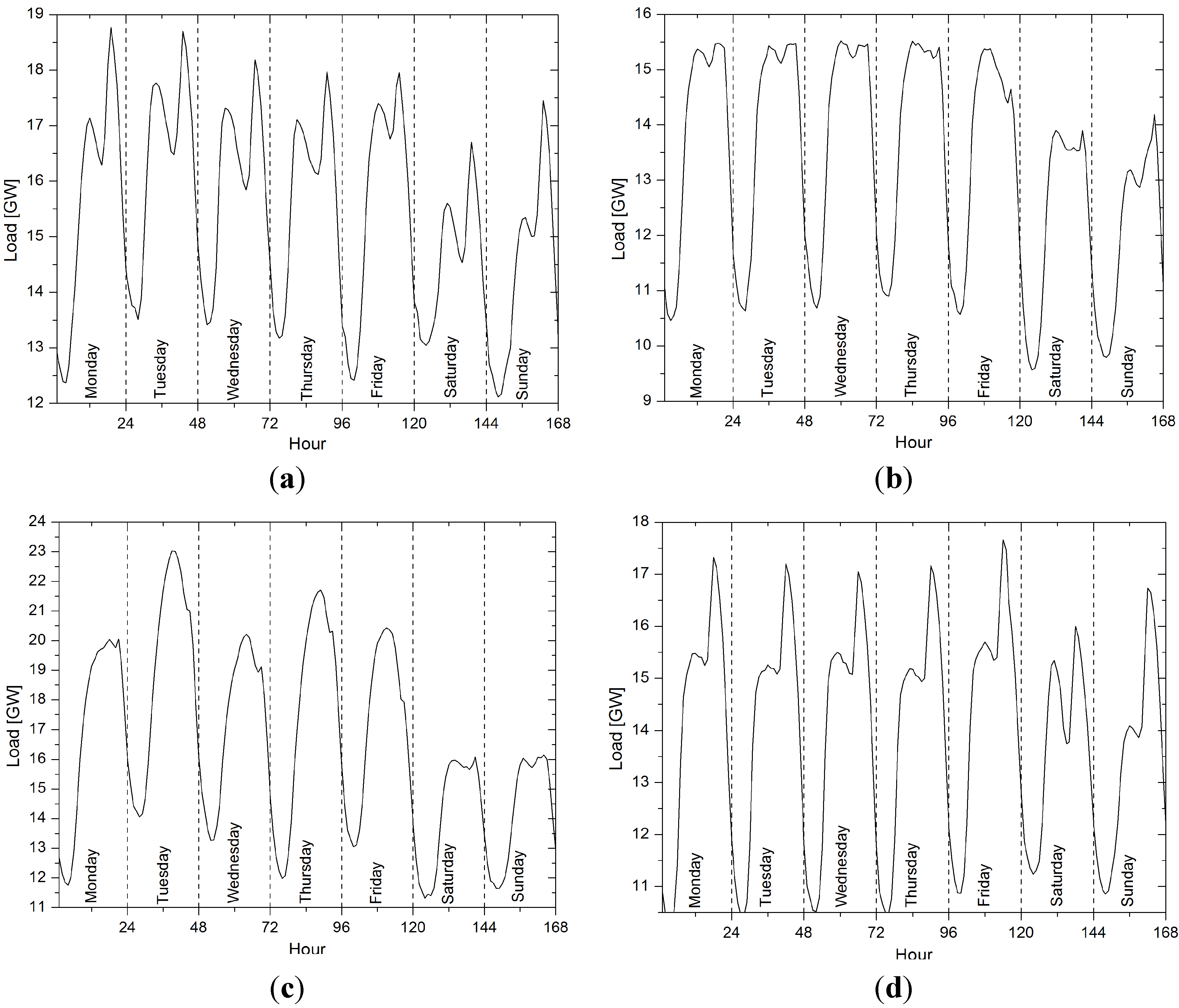 - Model II training set formation using hourly load data for the corresponding months from three previous years. This training set contains 2016 vectors in total and each vector is composed of features from 24 past hourly loads, the current day of the week indicator, the current hour of the day indicator and the current average daily load. Normalize all of the features in the [0–1] range by using min-max normalization,