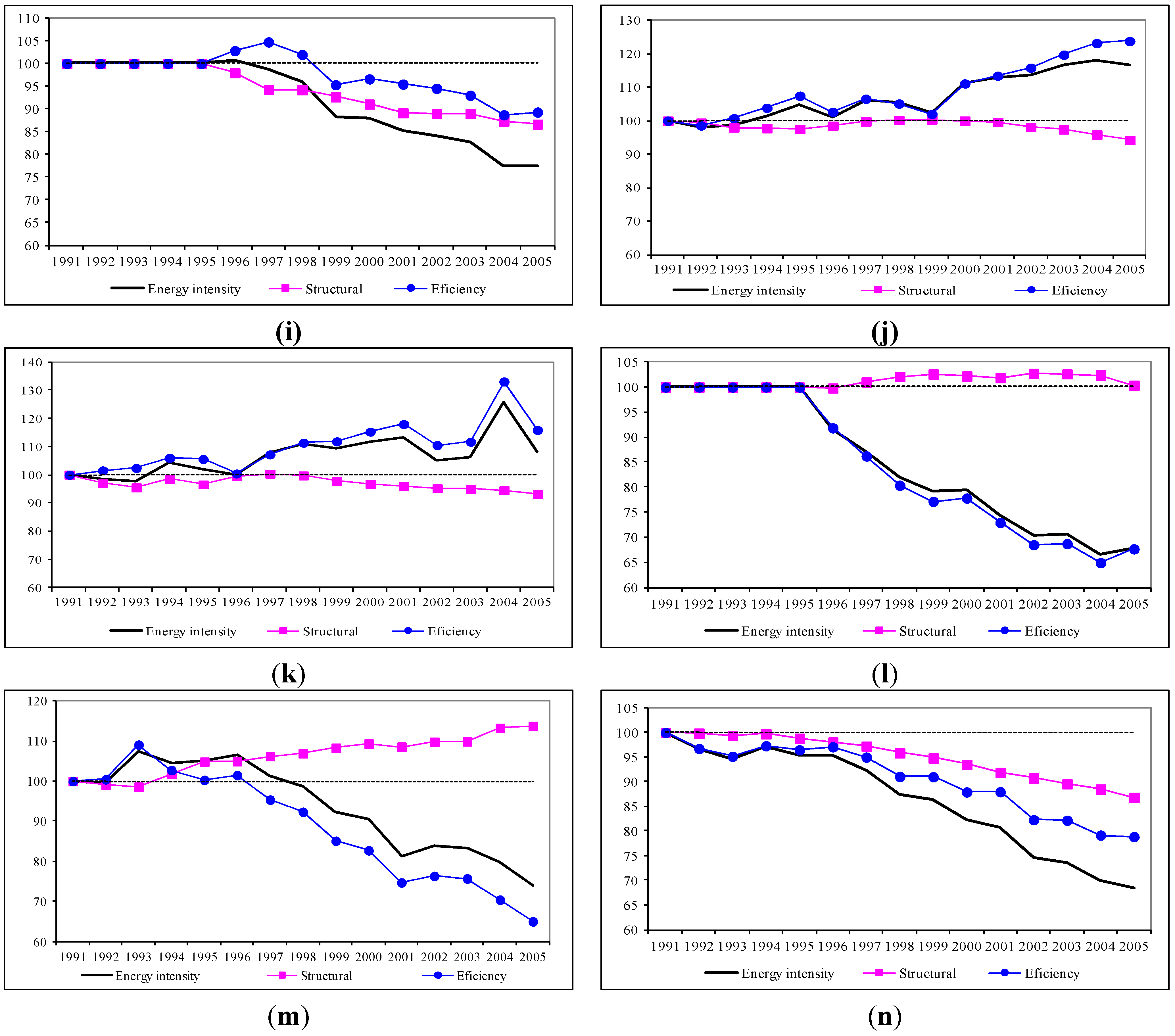 Table 3 shows the annual change in EI and distinguishes between the variations due to the structural and the efficiency component. The last two columns show the importance that changes in each component have on the total. With the exception of Austria, the one country where the weight of both components was similar, the efficiency component was much more important than the structural component in explaining the changes in total intensity. This result is according to [