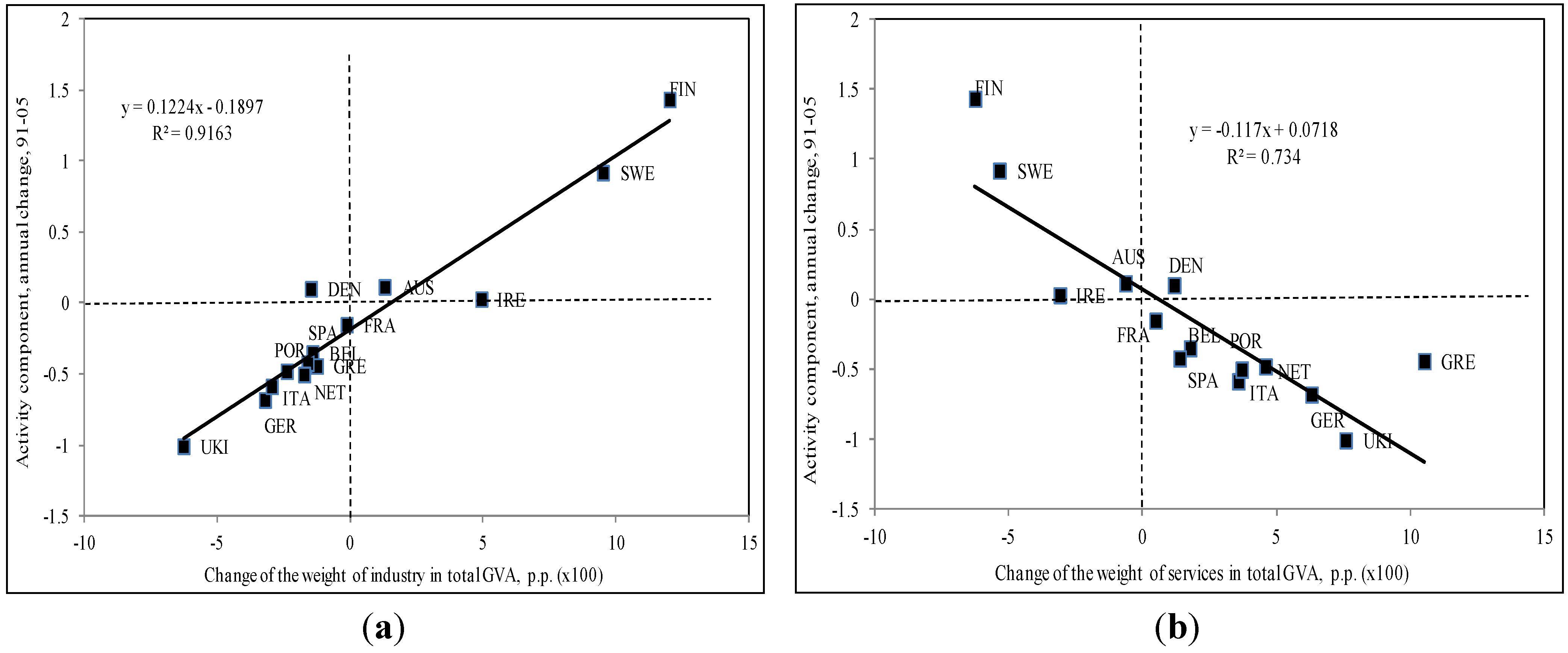EI structural component are due in large part to a transformation process in which the importance of industry in a country’s total economic activity drops, while that of services increases. As we have emphasized in the Introduction, this is a common finding in the literature.
