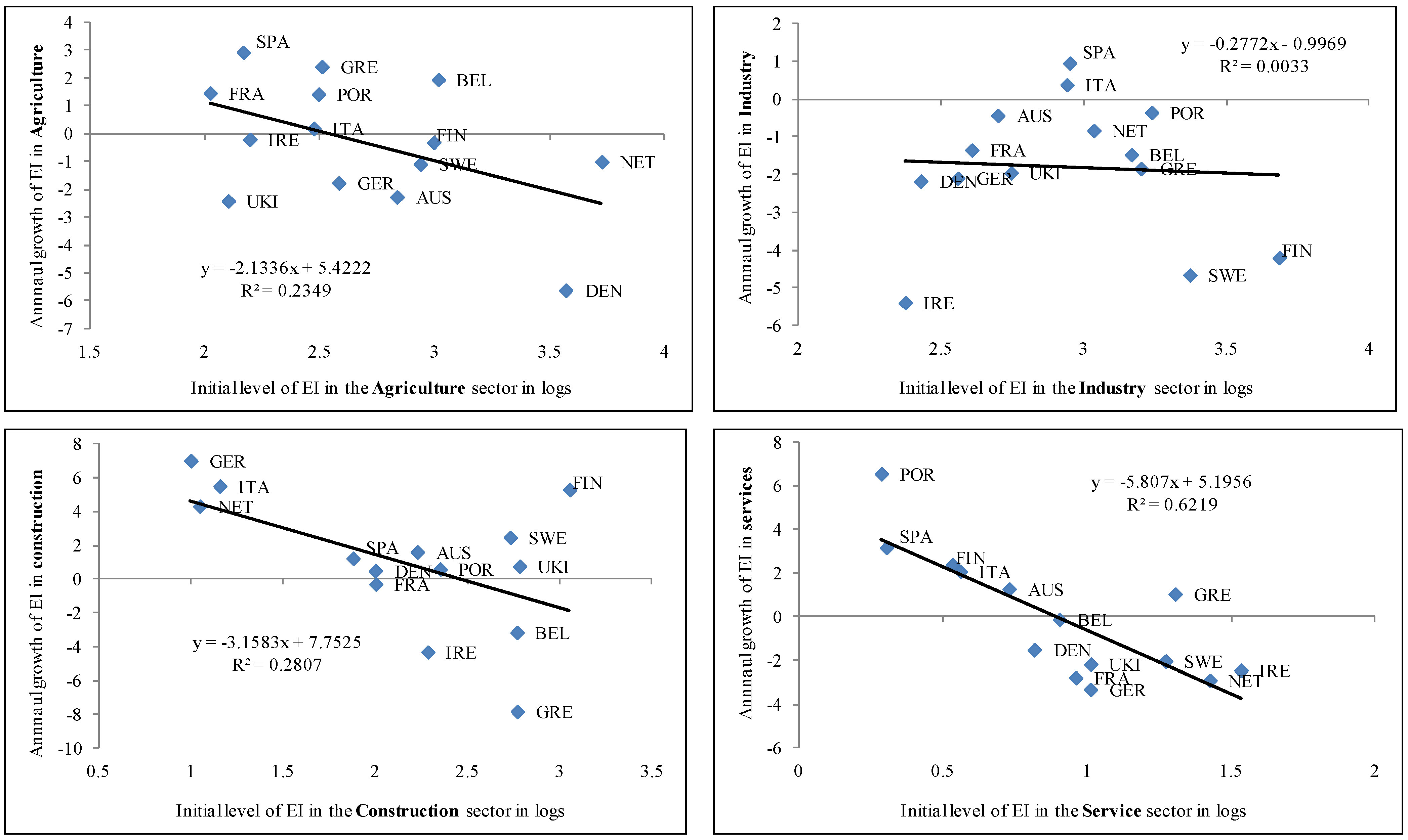 EI annual growth for the whole period (the y-axes). A negative slope in this relationship would be a clear symptom of absolute convergence. This negative relationship is precisely found for agriculture, construction but particularly for the service sector, while no negative relationship is found for the industry. These convergence results agree with those found by [