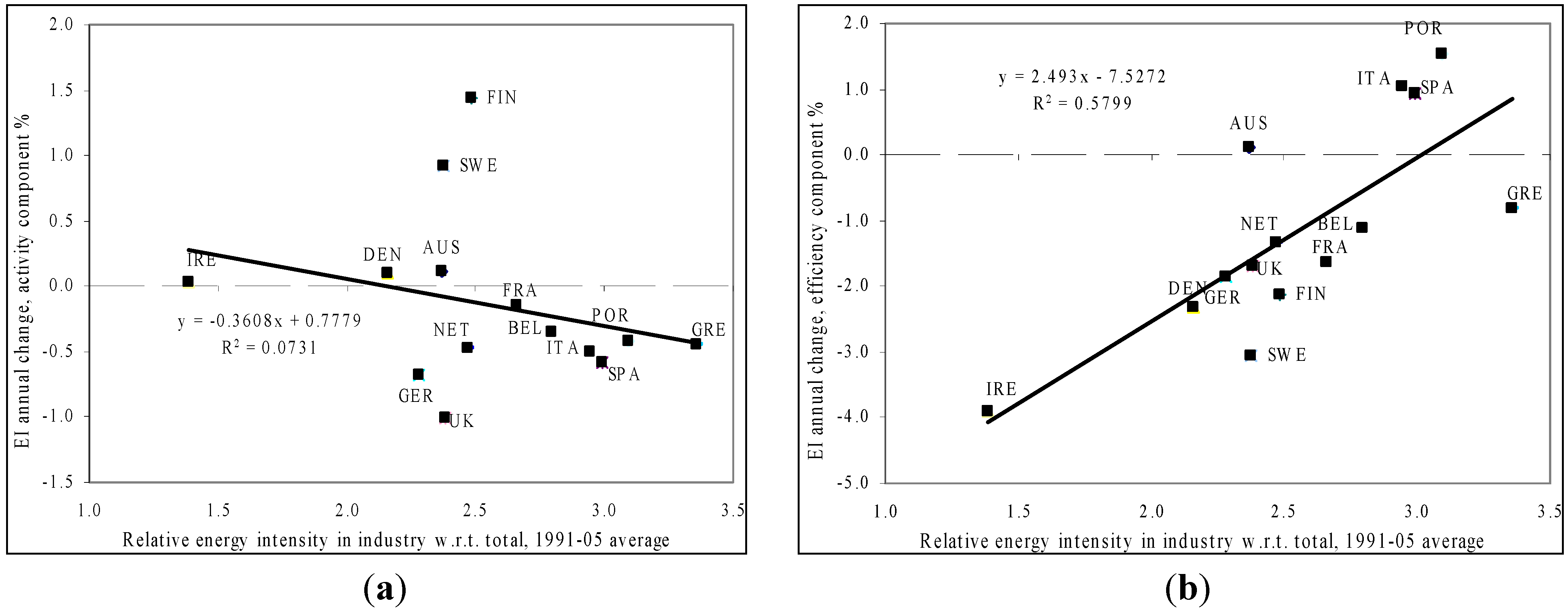 (a) Structural component and the Energy Intensity in the industry; (b) Efficiency component and the Energy Intensity in the industry.