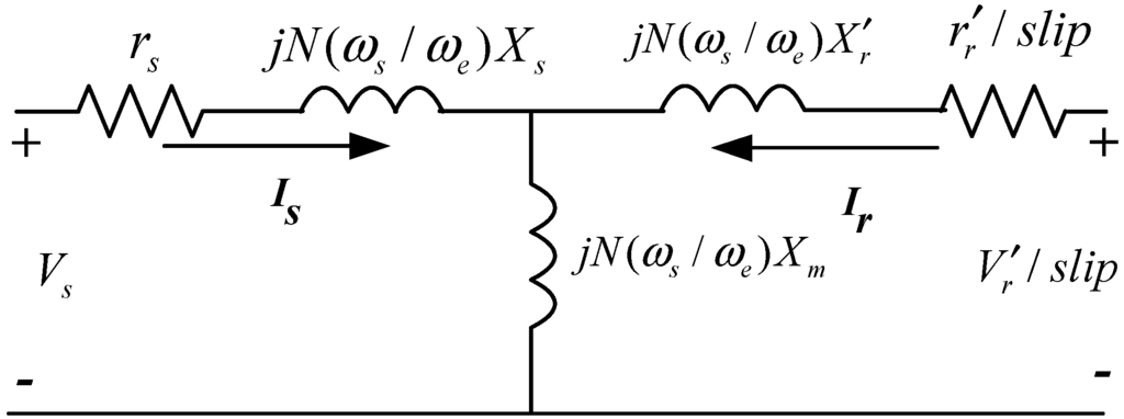The steady state circuit model of DFIG is shown in Figure 2 [19]. The term ωe is the nominal angular speed, ωs, ωr, ωm are the stator, rotor, and rotating angular speed, and N = ±1 represents the positive and negative circuit. When the fundamental power flow is studied, ωs = ωe, N = 1, .