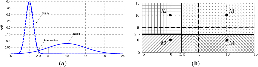 For example, the pdf of a phasor’s X component is combined by two Gaussian functions, N(0,1) and N(10,5). The intersection point is (2.3, 0.025), as shown in Figure 4a. x = 2.3 is set as the first division axis. The pdf of Y component is just the same, and y = 2.3 is the second division axis. x = 5 and y = 5 are the division axis under the shortest distance rule. The harmonic phasors between x = 2.3 and x= 5 should belong to the N(10,5) part, so the shortest distance rule is not adequate. Furthermore, the divided regions are presented in Figure 4b. The optimal phasor clustering method contains the whole probability property of harmonic phasors.