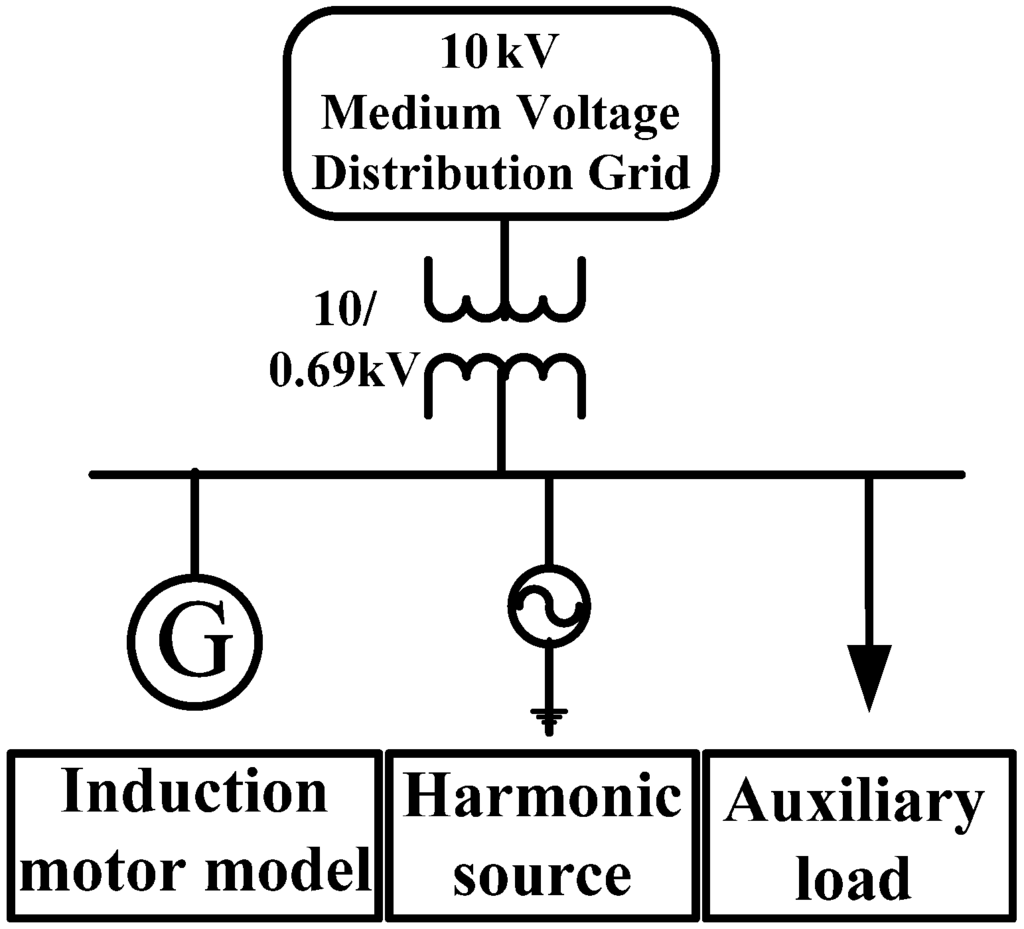 Non-characteristic and switching harmonic emissions of DFIG are discussed in this section. In order to study the harmonic propagation, the harmonic source model of DFIG is given in Figure 5. It consists of three parts: induction motor model is based on Figure 2; harmonic source part is the non-characteristic or switching harmonic emissions; auxiliary load is the supply load in the wind farm, and it can also be compensation devices.