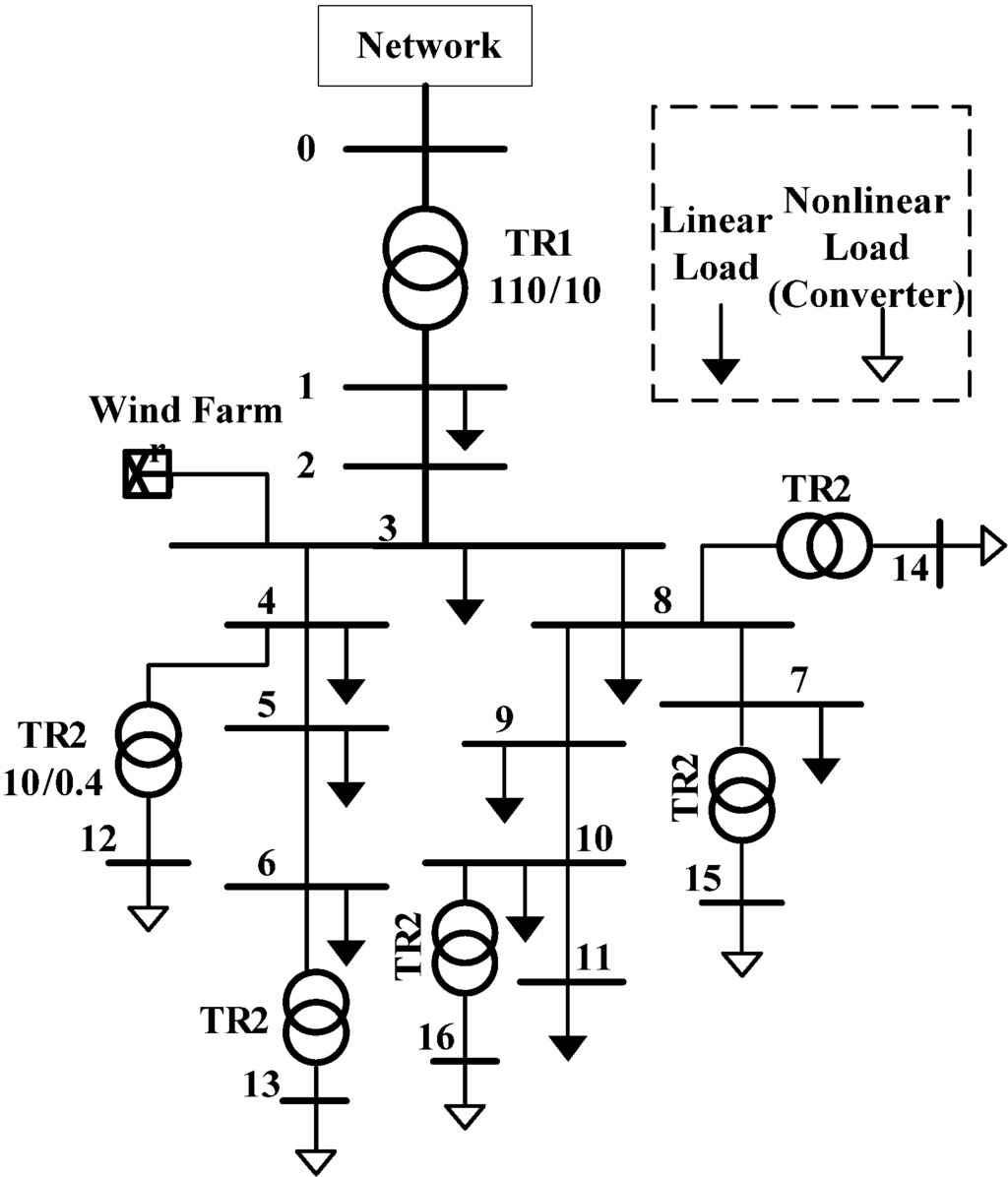 In order to verify the proposed models and method, a medium voltage distribution network is built based on the network benchmarks of CIGRE Task Force C6.04.02 [40]. The network benchmarks have been used in some European projects [41]. In this paper, the average voltage is set as 10 kV, and five converters are connected to the medium voltage network by the 10/0.4 transformers, as shown in Figure 7. The simulation system is established in PSCAD/EMTDC. The linear load and line parameters of the simulation system are given in reference [41]. A small-scale wind farm is installed at bus 3 to study the harmonic propagation between wind turbines and nonlinear loads. The wind farm consists of 3 × 1.5 MW DFIG wind turbines connected to the medium voltage grid by the 10/0.69 kV transformers, and the parameter values of DFIG are given in Table 1.