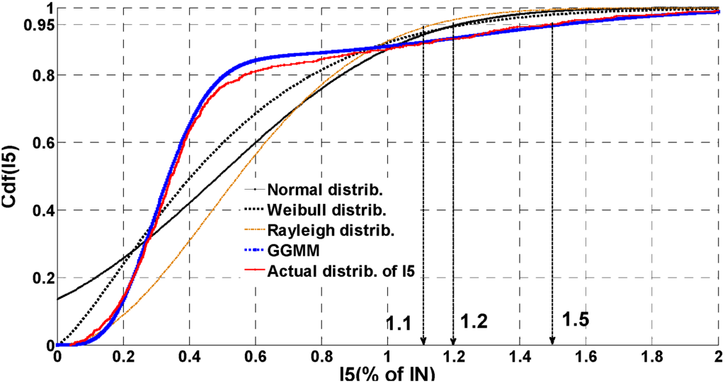 The 95% value of the fifth harmonic voltages is defined as an index, CP95, which is used to compare the different distributions. In Figure 13, CP95 of GGMM and the actual data distribution are both 1.5 p.u., but CP95 of Normal distribution, Weibull and Rayleigh distributions are 1.1 and 1.2 p.u., so the cdf of the fifth harmonic current can be more accurately approximated by the GGMM.