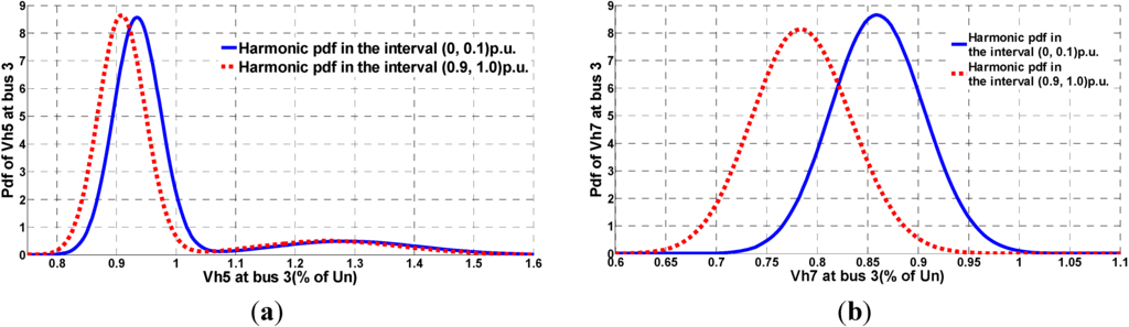 The pdf of the fifth harmonic voltage at bus 3 is approximated by GGMM, and the pdfs in (0, 0.1 p.u) and (0.9 p.u., 1 p.u.) are shown in Figure 14a (real line) and Figure 14a (dashed line). Then the pdf of the seventh harmonic voltage at bus 3 is shown in Figure 14b. The harmonic voltage distribution in the higher interval is closer to zero because the wind power in the higher interval is larger. Larger wind power improves the fundamental voltage, and then the voltage harmonic distortion level is reduced.