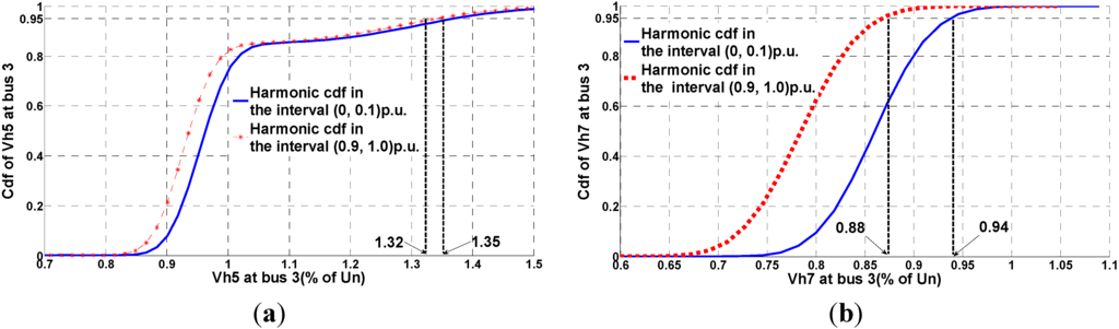 The index CP95 is used to evaluate the cdfs of the harmonic voltages at bus 3, and the cdfs of harmonic voltages are shown in Figure 15. CP95 of the fifth harmonic voltage in (0, 0.1 p.u) and (0.9 p.u., 1.0 p.u.) are 1.32% and 1.35%. The difference of CP95 between the two intervals is quite small. Based on the Figure 14a, the main part of the pdf of the fifth harmonic voltage is closer to zero when the interval value is bigger. But the other part between 1.1% and 1.5% changes a little. The different CP95 values reflect the final harmonic distortion level, and each part of the generalized gamma mixture models is important.