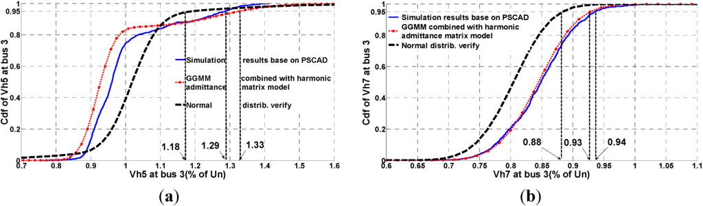 Similar to the harmonic analysis in (0, 0.1 p.u) and (0.9 p.u., 1.0 p.u.), pdfs and cdfs of harmonic voltage at different buses are analyzed. Then the final pdf and cdf of the harmonic voltage are the linear combination of ten intervals with different weighted coefficients. The comparison of the cdfs of the harmonic voltages at bus 3 between GGMM and simulation results in PSCAD/EMTDC is shown in Figure 16.