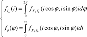 , rXhYh is the correlation coefficient of Xh and Yh, μXh and μYh are the mean values, σXh and σYh are the standard deviation values.The pdfs of Ih and ϕh are given by Equation (4):