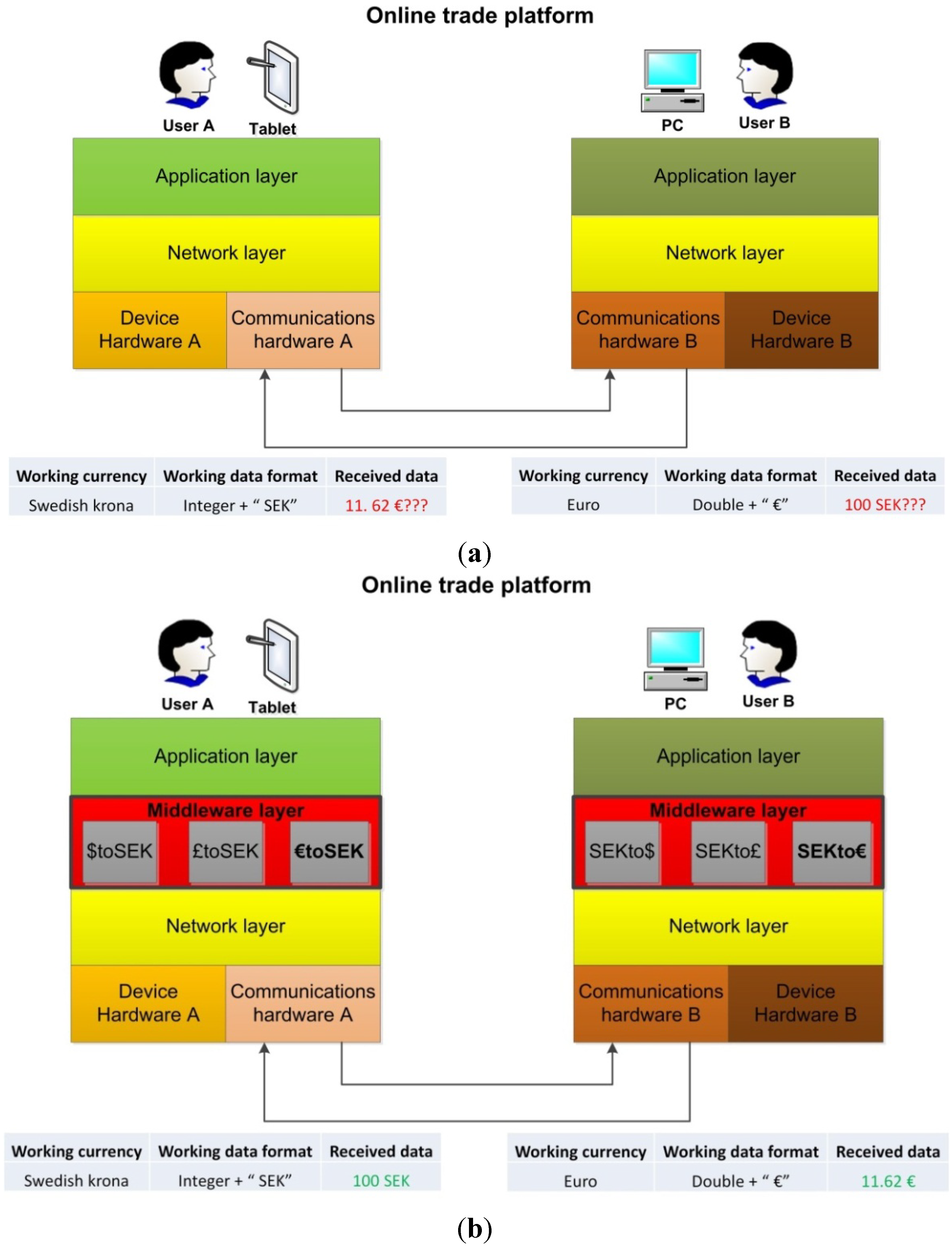 In order to integrate all the different devices that will be providing communication data, a unifying layer is required. This layer will abstract not only all the complexity of the lower components of the Smart Grid used for smart metering and measuring, but also the structure of the power grid, thus keeping the user oblivious from its structure. It is because of this issue that a middleware layer has to be developed, thus integrating the very different components a Smart Grid is equipped with into one homogeneous-looking layer. As displayed in Figure 1a, if an online trade platform is set up and currency exchanges have to be performed, chances are that the platform will malfunction without a middleware layer. At first, there is no problem at the lower layers due to the fact that they are managing Protocol Data Units (PDUs) rather than the application content inside, and as long as the PDUs have acceptable fields in terms of existence and/or length, no issues will appear. However, when that content is accessed by the applications it is very likely that they will present interpretation problems (for example, if it was retrieved from a piece of equipment with a different processor or different byte storage methods). Nevertheless, if a middleware intermediate layer is used, data can be converted according to the needs of a particular application layer, thus solving any format-related issues, as depicted in Figure 1b.