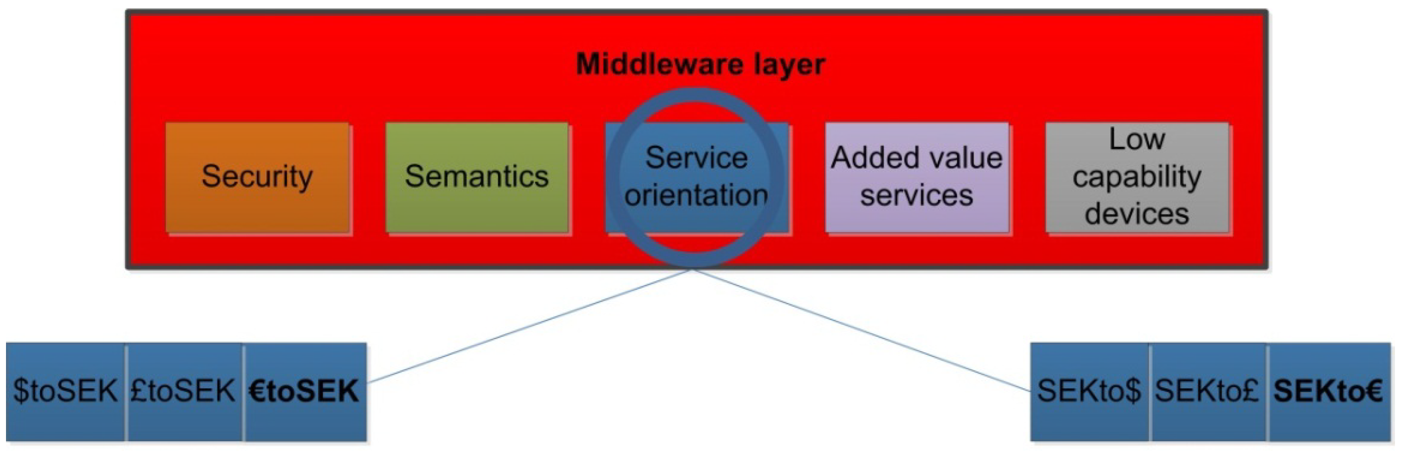 Regarding the Smart Grid, a middleware layer is expected to take into account several features: security for data transfer between entities, semantic treatment of information, service orientation for better user attendance, services that provide an added value to the architecture (such as Quality of Service) and flexibility in order to deal with feedback from low capability devices. In the previous example of the online trade platform, the methods required to interchange currencies could be considered as part of the services that are provided to the end users, and these methods will be encased within the middleware architecture. A more detailed perspective can be obtained from Figure 2.