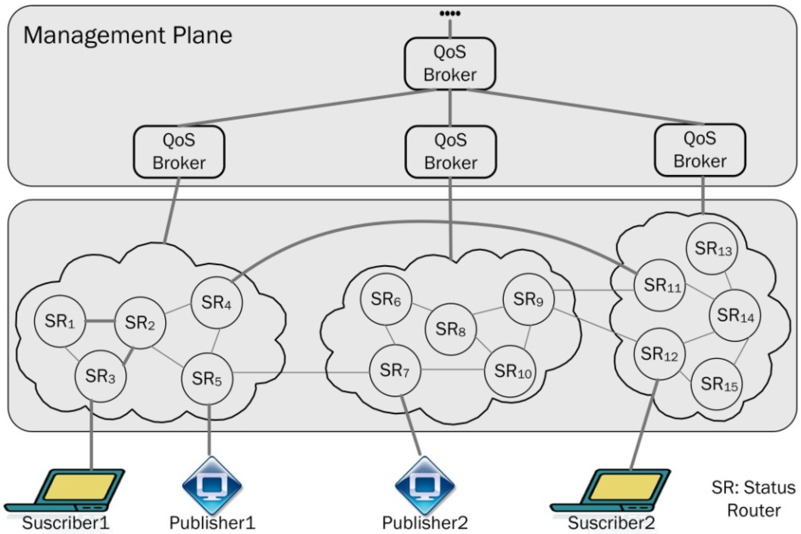 The GridStat architecture has been designed considering two different levels or planes: a management plane—charged with resource allocation and data adaptation regarding changing circumstances, as power configurations and system failures—and a data plane—the layer that will forward data from the sources to the destinations depending on the orders of the management plane. Each of the levels has several inner components as well: within the data management plane there are several entities named QoS brokers organized according to a hierarchy (where the lowest level QoS brokers are named leaf QoS brokers and will interact with the data plane). At the data plane, though, there will be several, plainly organized status routers that will be connected to equipment able to process requests and responses following a publication-subscription model for their communications. Several status routers will be managed by one leaf QoS broker in a cloud. An overview of GridStat architecture is presented in Figure 3.