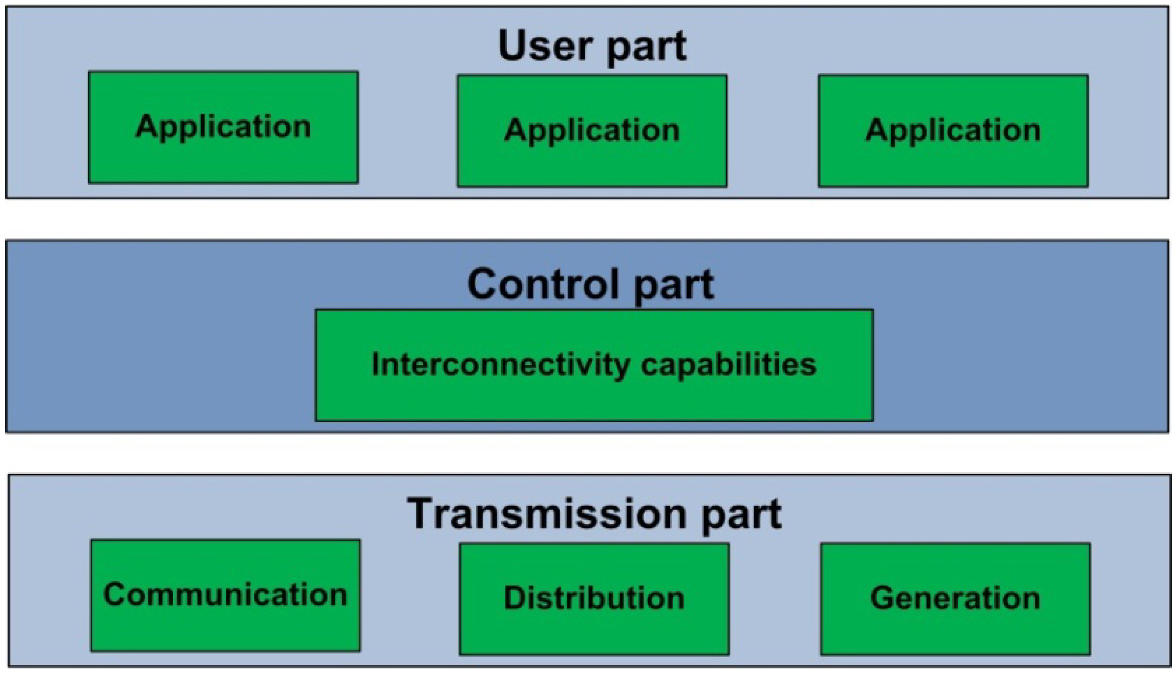 | Transmission part | Transmits electrical power from generation To distribution centers. Made up by generation, communication and distribution modules. |