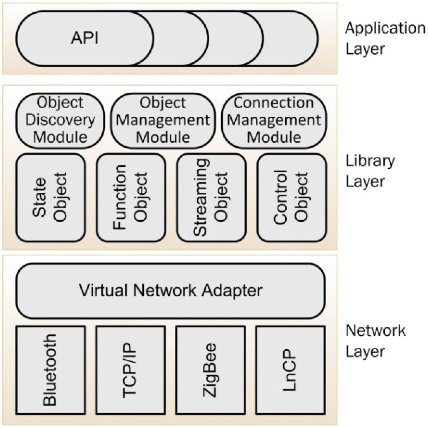 | Library layer | Made up by an object discovery module, an object management module, a connection management module and several objects (state object, function object, streaming object, control object) |