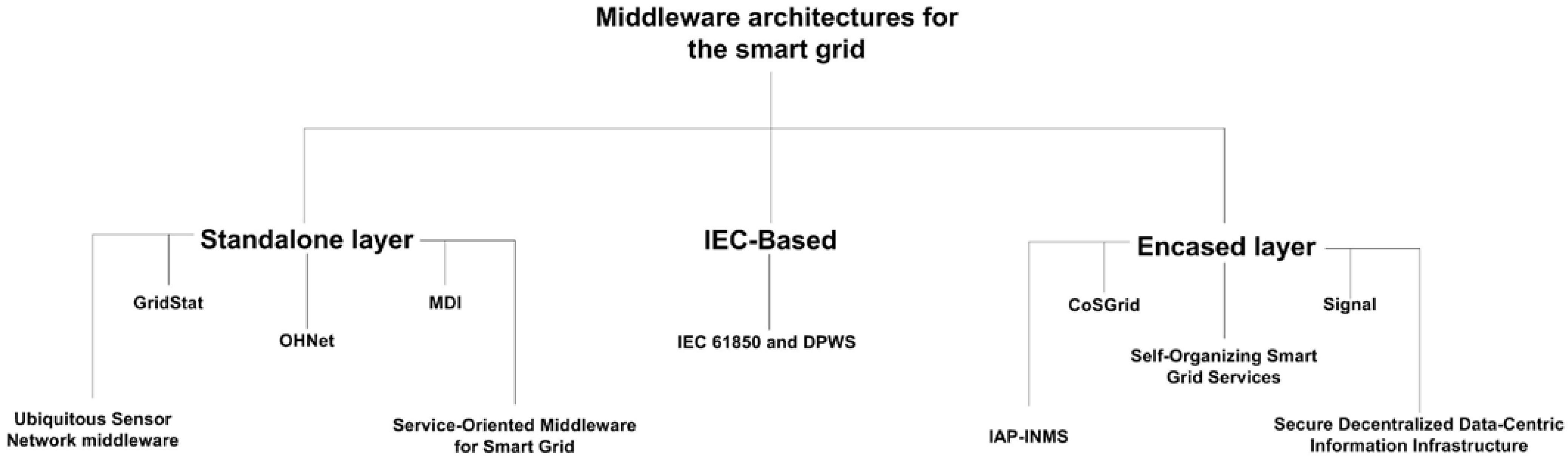 It can be claimed that there are three different kinds of middleware architectures for the Smart Grid: firstly, the ones based on standards published by the International Electrotechnical Commission or IEC—which often combine elements of already established solutions, such as IEC 61850 or IEC 61970 in [17] or [18]—to provide middleware functionalities in Smart Grids. Secondly, another different kind where middleware architectures are conceived as a standalone layer that exists independently. Finally, a third group where middleware architectures for the Smart Grid must be encased in a particular architecture and have less strict boundaries. All these architectures have been surveyed and are described in the following sections.
