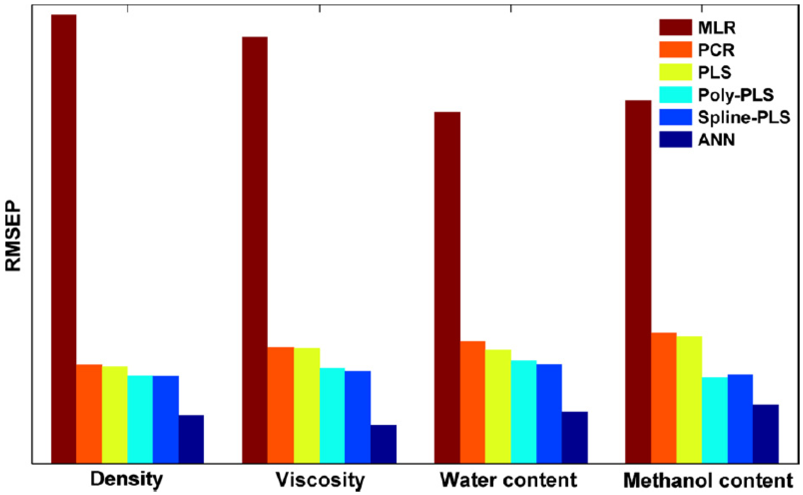 | Balabin et al. [165] | Density, kinetic viscosity, water and methanol content prediction for various biodiesels |
