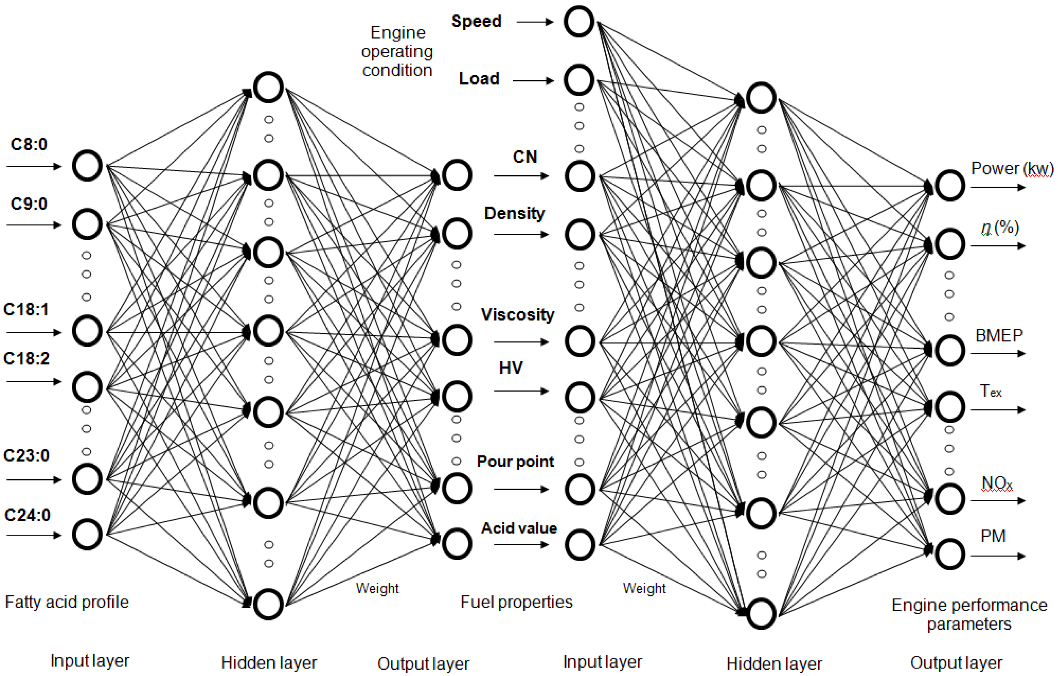 Recent literature shows that the complex relationship between biodiesel chemical composition, fuel properties and diesel engine combustion performance can be established at different operating condition conation by using ANNs. Several ANN models have been developed to estimate the combustion-related performance of various fuels in automobile engine applications with a high prediction accuracy, as shown in