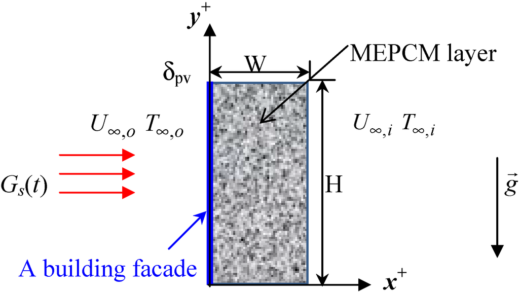 Figure 1 shows a building facade integrated with a MEPCM (in grey color), where a building integrated PV (BIPV) panel was used as the investigated building façade in this study. Gs(t) represents the incident solar irradiation that penetrates a PV cell of thickness δpv. The top and bottom surfaces of the PV/MEPCM layer are assumed to be thermally insulated. The MEPCM layer has thickness W and length H.