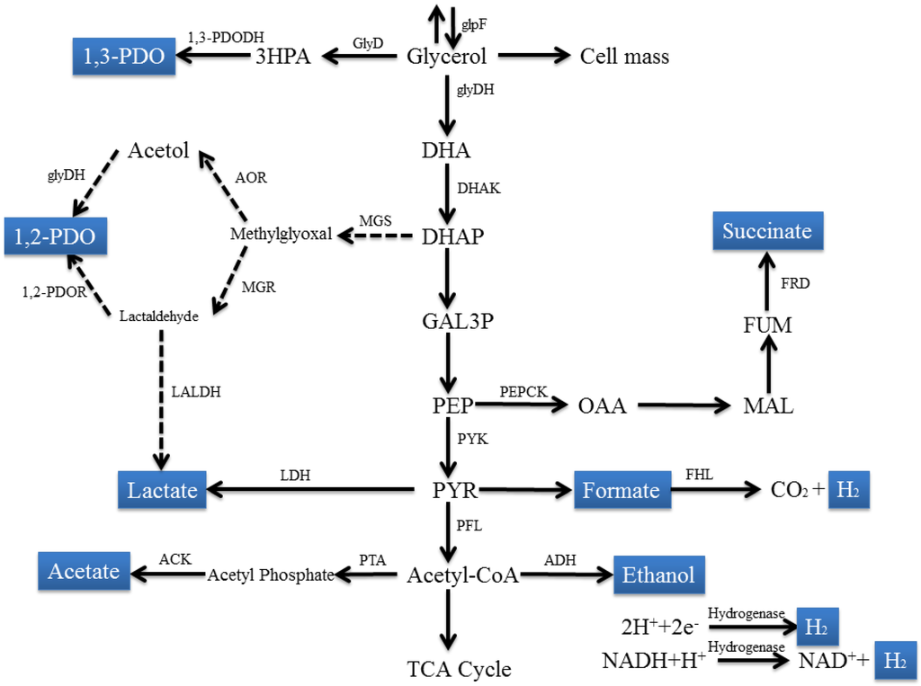 Prokaryotic pathway of glycerol utilization in Entrerobacteriaceae species (adapted from [4,17]). Enzymes: ACK, acetate kinase; ADH, acetaldehyde/alcohol dehydrogenase; AOR, aldehyde oxidoreductase; DHAK, dihydroxyacetone kinase; FHL, formate hydrogen lyase complex; FRD, fumarate reductase; GlyD, glycerol dehydratase; glyDH, glycerol dehydrogenase; glpF, glycerol transporter, LALDH, lactaldehyde dehydrogenase; LDH, lactate dehydrogenase; MGR, methylglyoxal reductase; MGS, methylglyoxal synthase; PFL, pyruvate formate-lyase; PEPCK, phosphoenolpyruvate carboxykinase; PTA, phosphate acetyltransferase; PYK, pyruvate kinase; 1,2-PDOR, 1,2-propanediol reductase; 1,3-PDODH, 1,3-propanediol dehydrogenase. Chemical intermediates and products: DHA, dihydroxyacetone; DHAP, dihydroxyacetone phosphate; FUM, fumarate; GAL3P, glyceraldehyde-3-phosphate; 3HPA, 3-hydroxypropionaldehyde; MAL, malate; OAA, oxaloacetate; PEP, phosphoenolpyruvate; PYR, pyruvate; 1,2-PDO, 1,2-propanediol; 1,3-PDO, 1,3-propanediol. (Dash line indicates reactions for 1,2-PDO pathway; filled box indicates potential products).