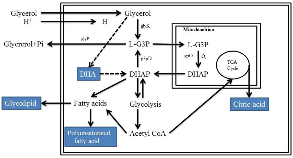 Enterobacteriaceae is a large family of gram-negative bacteria that includes Escherichia, Klebsiella, and Citrobacter among others [16]. The glycerol utilization pathways in Entrerobacteriaceae have been intensively studied with the goal of industrial production of 1,3-propanediol (1,3-PDO) [6]. These pathways may also be applied to some other bacteria that contain similar metabolic grids. Figure 2 illustrates the general metabolic pathways for glycerol utilization in Entrerobacteriaceae.