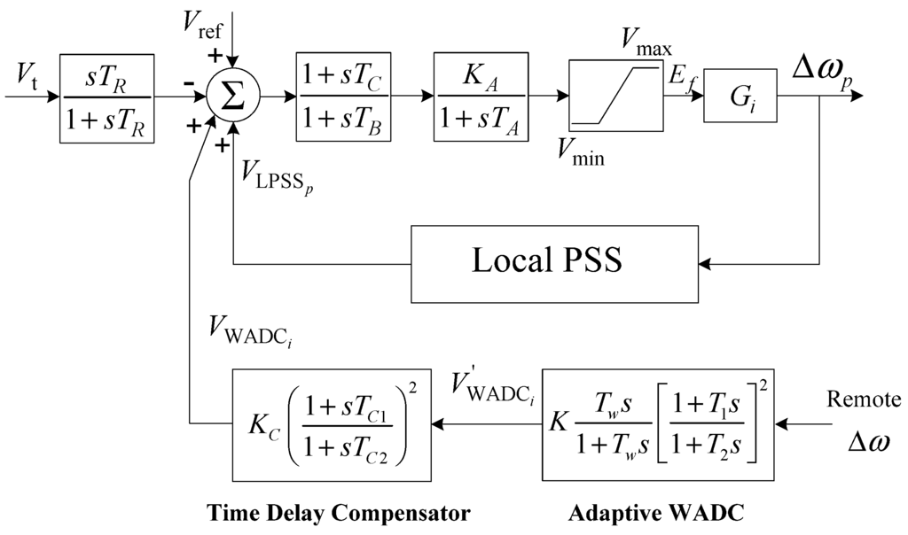 The exciter model with a two-layer PSS structure is shown in Figure 1. The two-layer PSS structure serves the following two functions [15]: (1) both local and inter-area oscillation modes can be suppressed; and (2) in case the adaptive WADC fails to act due to loss of PMU data or communication network failure, the independent local power system stabilizer (LPSS) remains operational and is capable of suppressing local oscillation modes and supply a certain amount of damping to the inter-area oscillation modes.