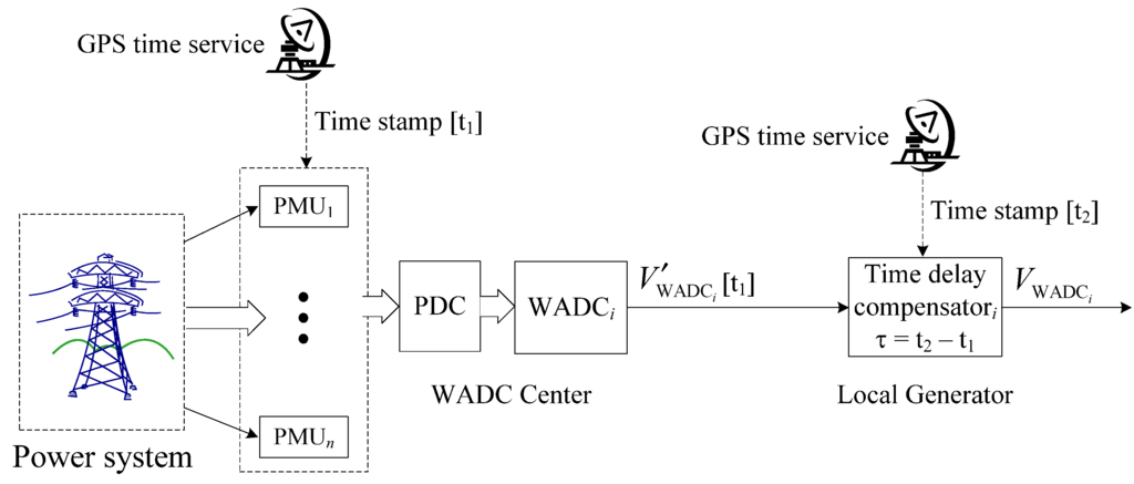 Accurate time from the GPS would be received locally in both PMUs and the time delay compensator. Wide-area phasors measured by the PMUs at time t1 are collected and resynchronized by the phasor data concentrator (PDC) and in turn processed by the adaptive WADC to generate the wide-area damping control signal with time stamp [t1]. When the local time delay compensator, which is installed close to the generator exciter, receives the control signal [t1], the signal will be re-labeled with a new time stamp [t2] freshly obtained from the GPS and the exact time delay can be calculated accurately as because of the high resolution time service provided by the GPS.