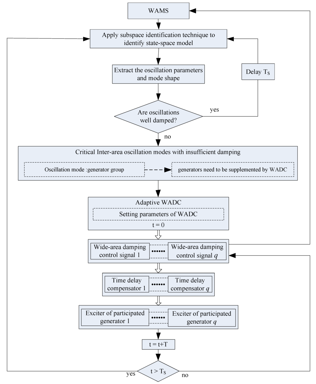 Figure 6 shows the overall flow chart of the proposed adaptive wide-area damping control scheme which mainly consists of the subspace identification algorithm based state-space model estimation, oscillation parameter extraction, adaptive WADC and time delay compensator described in previous sections. The control algorithm operates on windows of WAMS data with cycle time TS and could be triggered by timer, events or operator.