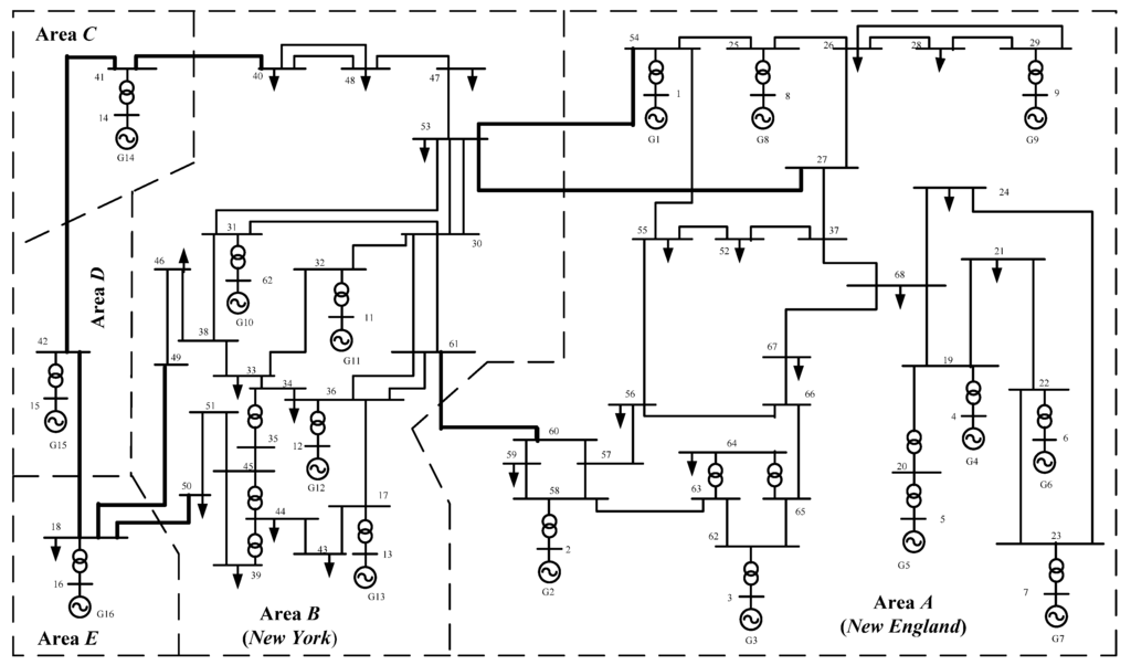 The IEEE 16-generator 5-area test system shown in Figure 7 was selected as the benchmark system for evaluating the performance of the proposed adaptive wide-area damping control scheme with consideration of signal time delay.