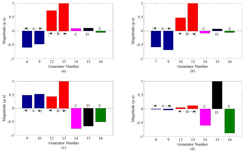 Figure 8 shows the four identified critical inter-area oscillation mode shapes with lager participation factor in each oscillation group.